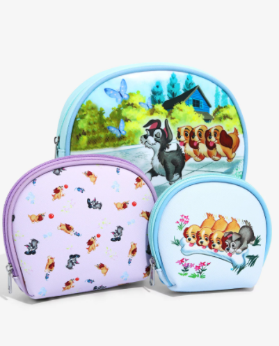 ¡También puedes robar el look para tu próximo desafío de maquillaje de ojos! Guarde su maquillaje en este juego de neceseres de piel sintética que incluye tres bolsitas, cada una con un diseño de Scamp, Annette, Collette y Danielle de Lady and the Tramp II: Scamp's Adventure. ¡Los cachorros juguetones también aparecen con un forro interior rosa pálido a juego!