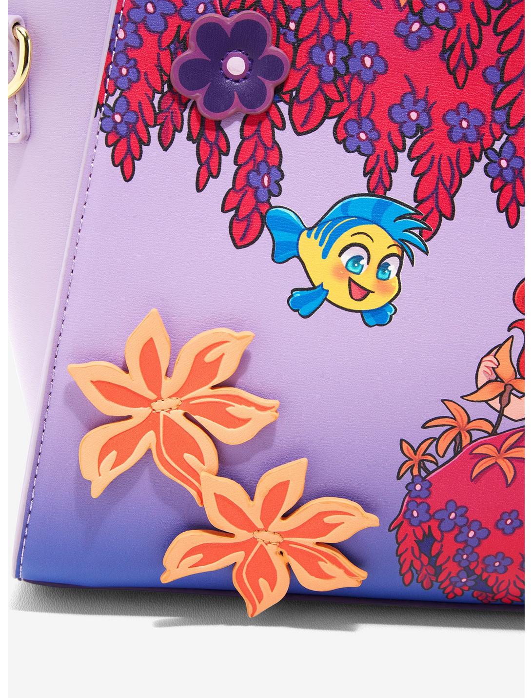 ¿Necesita un lugar para guardar todo su whositz y whatsits? ¡Este bolso de La Sirenita es justo lo que necesitas! Con Ariel y Flounder en un lado y Sebastian en el otro, este bolso tiene aplicaciones florales, una insignia troquelada, asas de transporte, una correa para el hombro ajustable y extraíble y un bolsillo interior con cremallera.