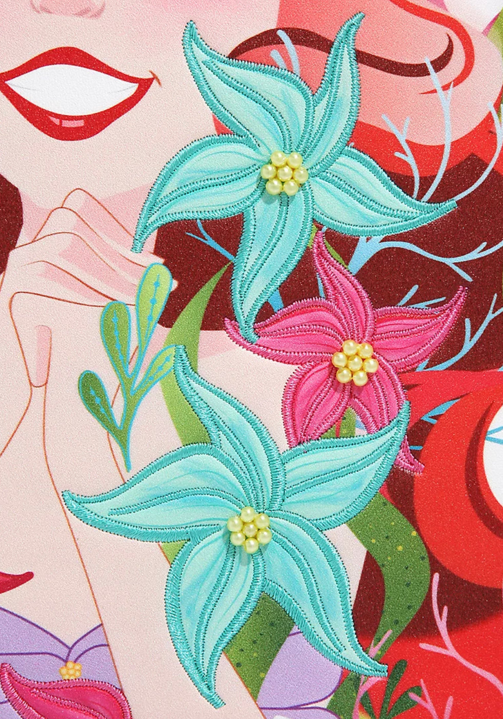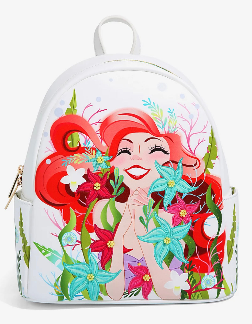 Ariel protagoniza un colorido diseño floral que combina bordados, aplicaciones de cuentas y elementos visuales dinámicos para un retrato alegre de la princesa de Disney. También cuenta con herrajes en tonos dorados, correas de hombro ajustables, un bolsillo interior con cremallera y un parche de la marca grabado.