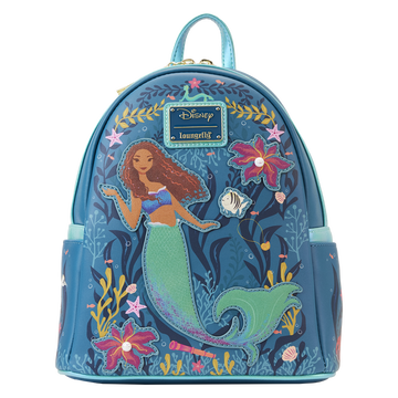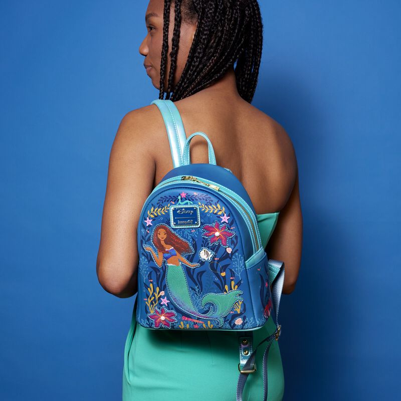 Explora la vida bajo las olas de una forma nueva e inspiradora. La mini mochila Loungefly Little Mermaid Live Action muestra hermosas obras de arte internas de Ariel mientras nada bajo el mar. Algas, corales y conchas marinas bordadas se esparcen por la parte delantera de la bolsa. Mire de cerca y encontrará algunos tesoros humanos flotando a lo largo del fondo del océano, ¡incluido un amuleto con cierre de dinglehopper!