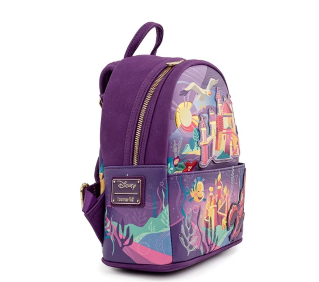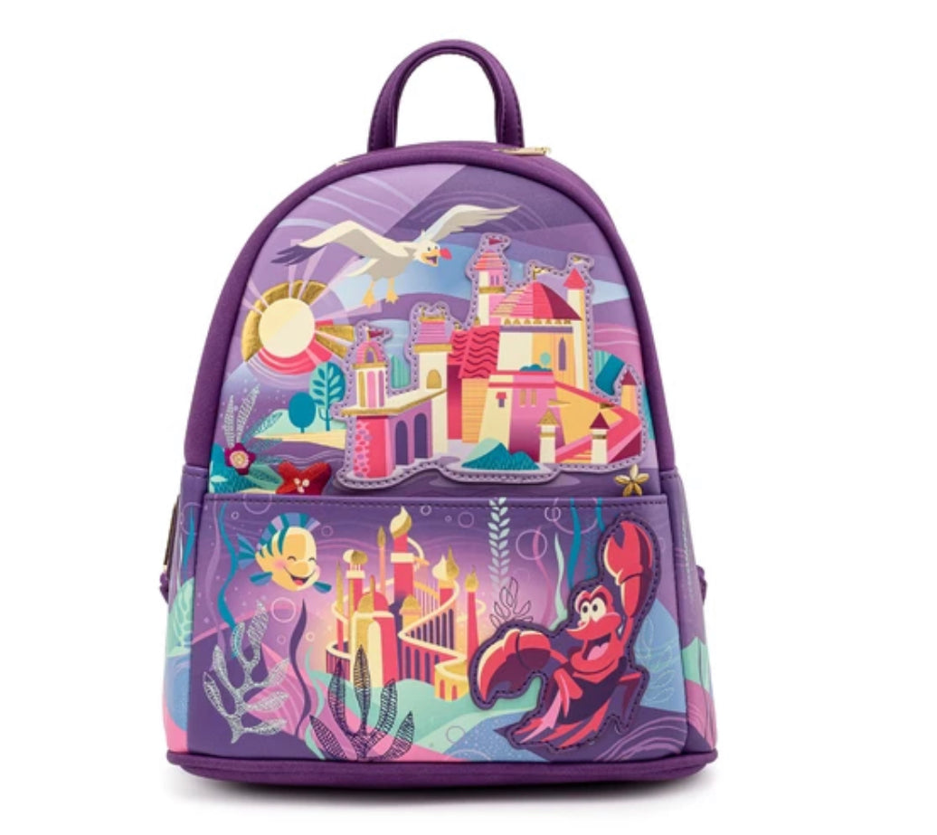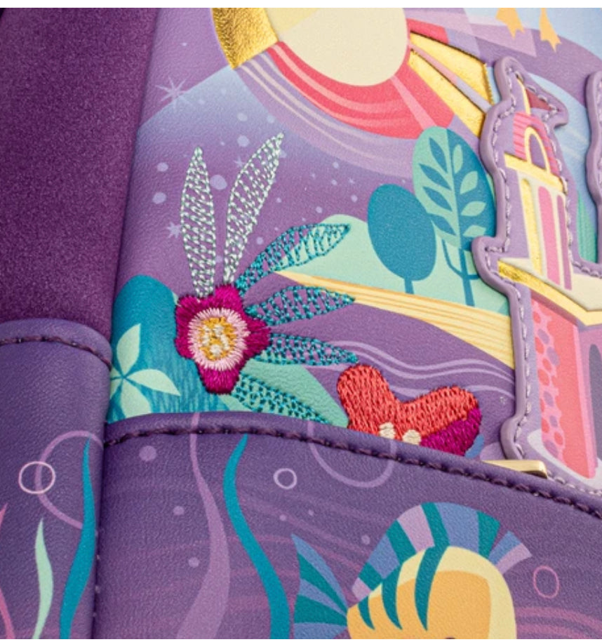Lleva las vibrantes y hermosas vistas del castillo submarino de Ariel y el castillo junto al mar con la minimochila Loungefly Disney The Little Mermaid Ariel Castle. Sebastian y Flounder están nadando entre los corales y las algas que rodean el castillo submarino del rey Tritón, mientras que el castillo del príncipe Eric está cerca de la costa.