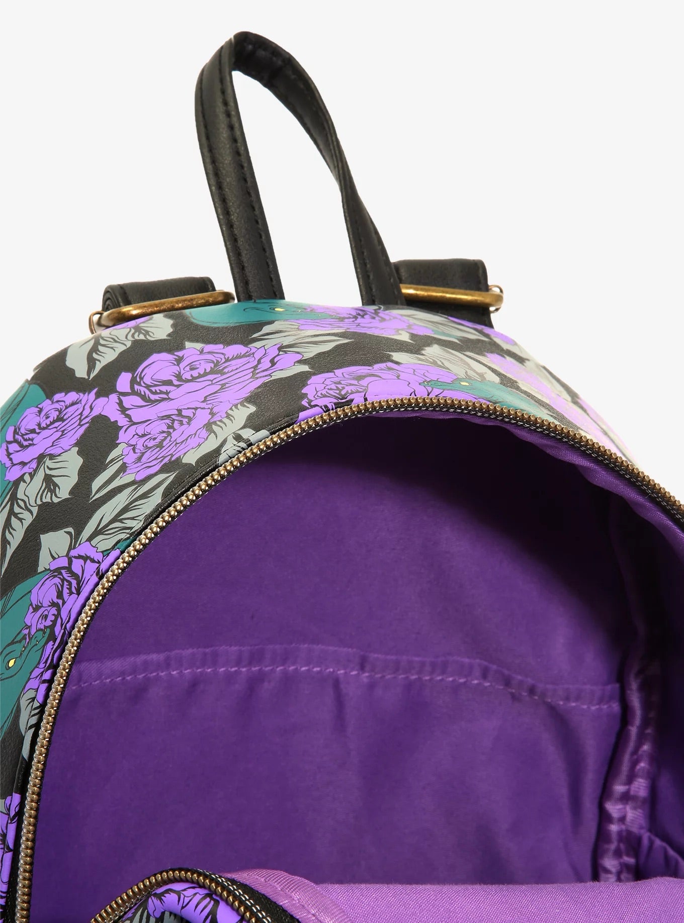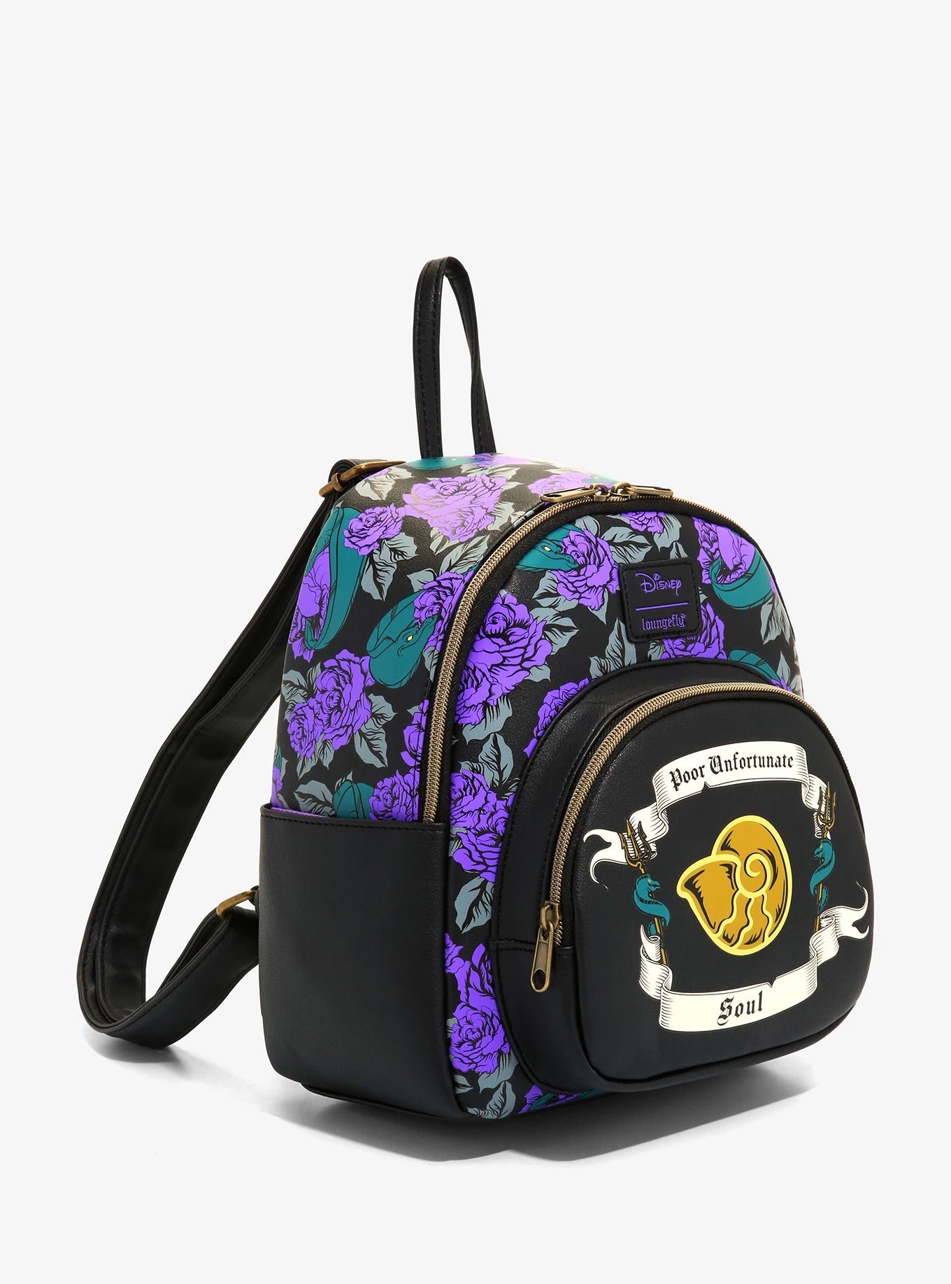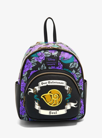 ¡No seas un alma pobre y pasada de moda! Esta mini mochila está sirviendo las malas vibraciones que necesitas. Hay un estampado completo de rosas púrpuras, Flotsam y Jetsam.