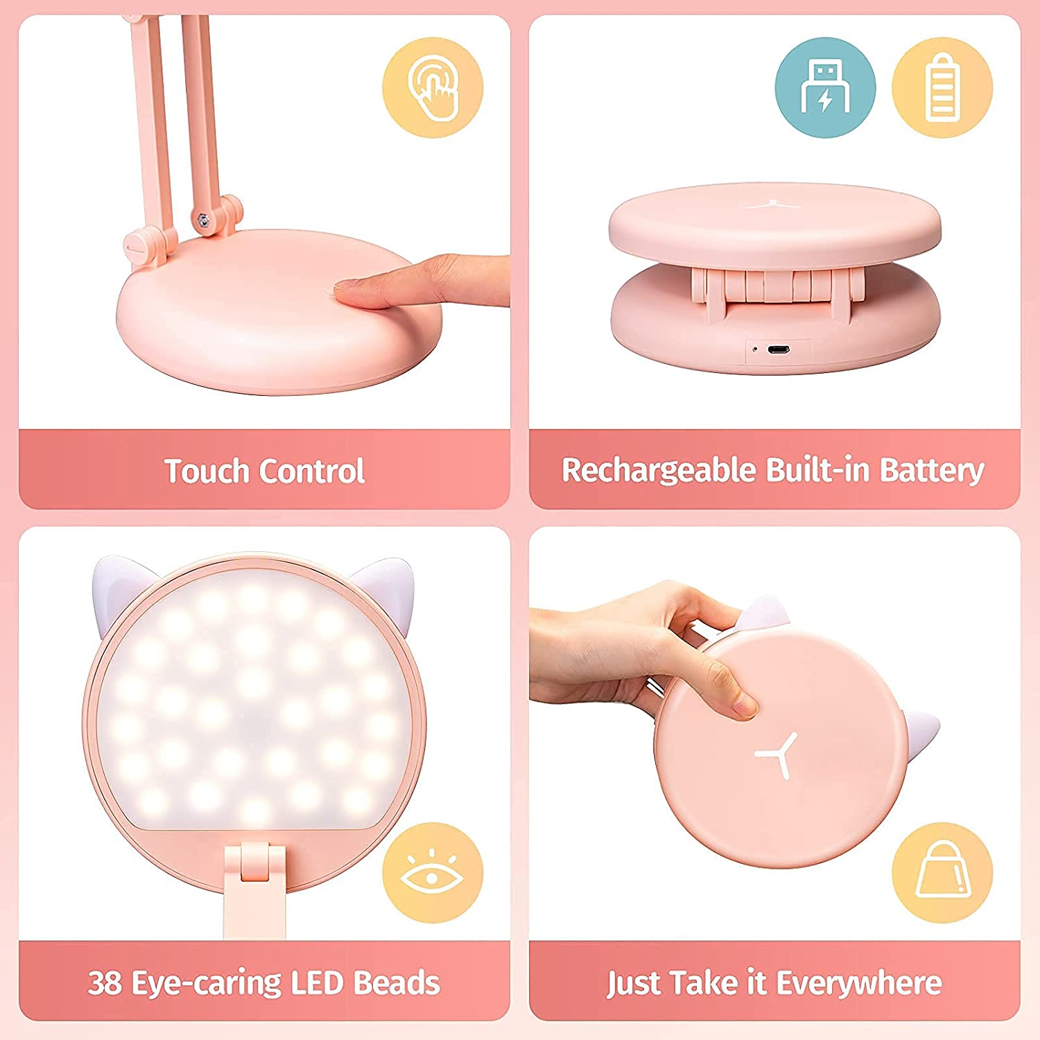 - ❤ Lámpara LED de escritorio: cuidado de los ojos y portátil: la bonita lámpara de escritorio brilla con una luz LED de escritorio sin parpadeo que es suave para los ojos. ¡Una lámpara LED de escritorio para la oficina en casa! También es una bonita lámpara de escritorio plegable. Después de plegarse, la lámpara LED de escritorio se convierte en una pequeña "galleta", puedes meter la pequeña lámpara de escritorio en una bolsa/cajón, o llevar la pequeña lámpara de escritorio a cualquier lugar sin un cable. Una lámpara portátil y una bonita lámpara de escritorio. ¡Una lámpara de escritorio rosa inalámbrica! ¡Una lámpara de escritorio LED que cuida los ojos!
