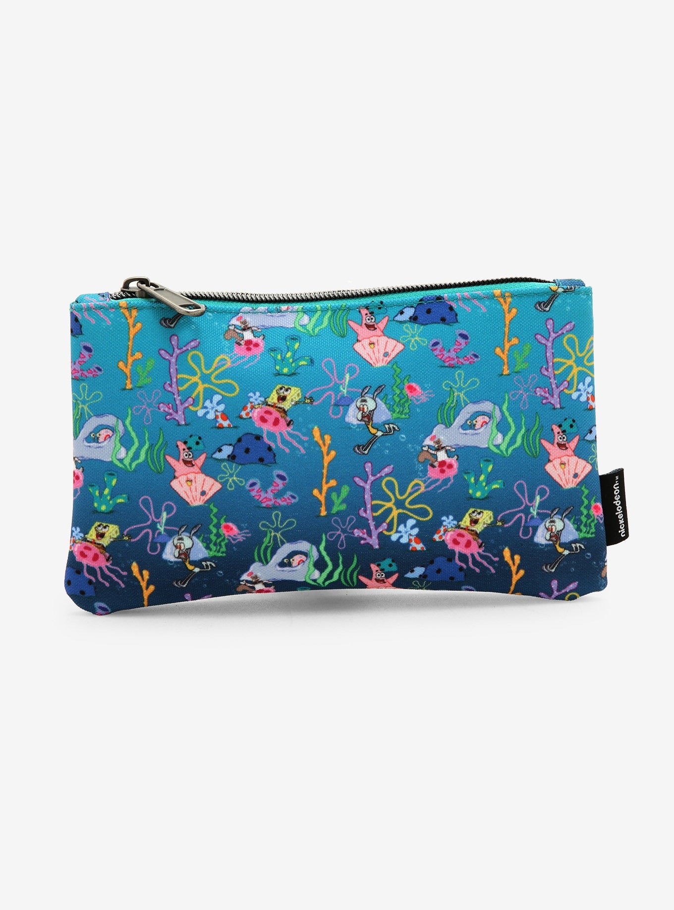 Este estuche presenta una impresión de Bob Esponja, Patricio, Sandy y Calamardo y herrajes plateados antiguos.