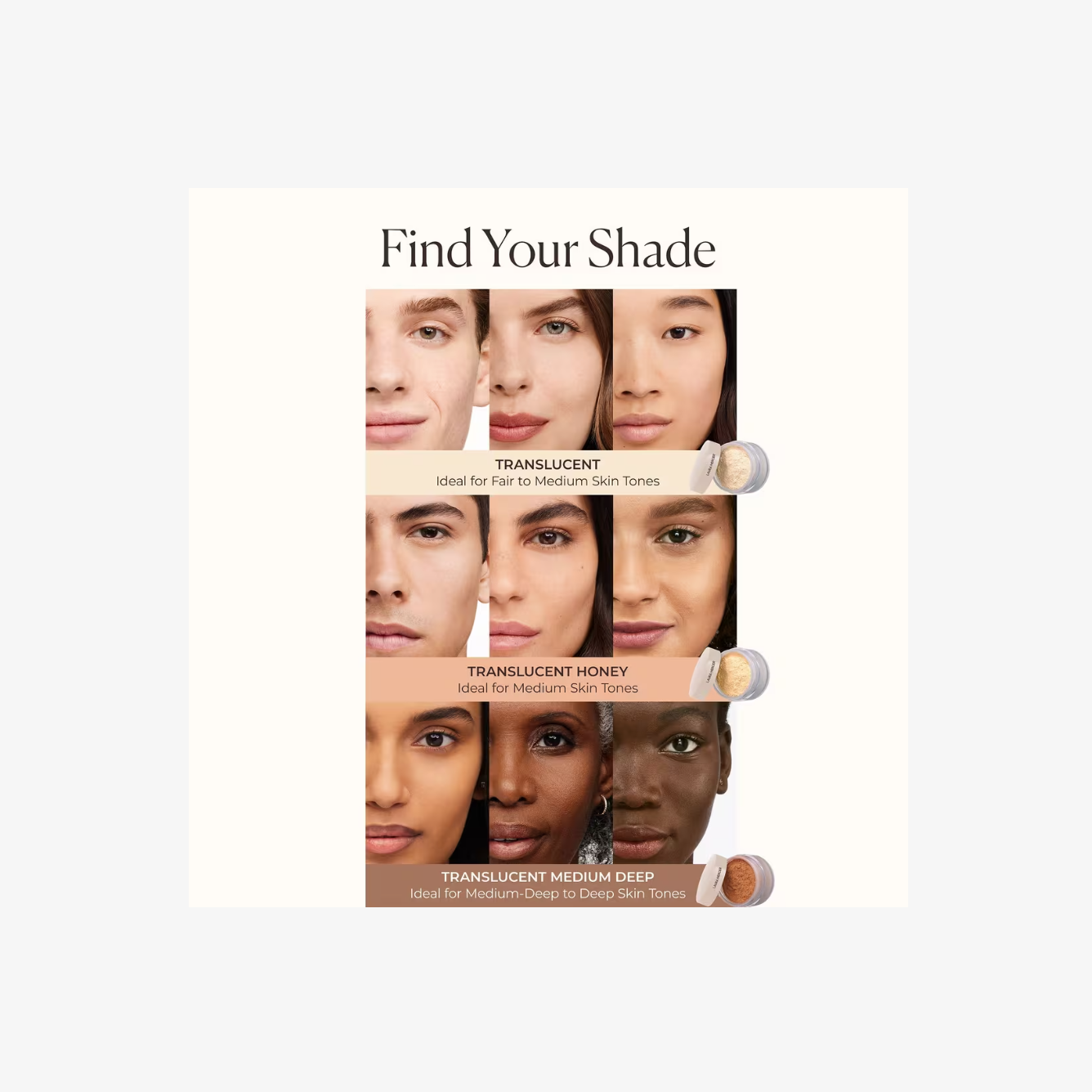 Polvo suelto translúcido de Laura Mercier, libre de talco e infundido con ácido hialurónico, que ofrece hasta 16 horas de confort y un efecto ultra-difuminador. Su textura ligera deja la piel suave, lisa y con un acabado impecable.