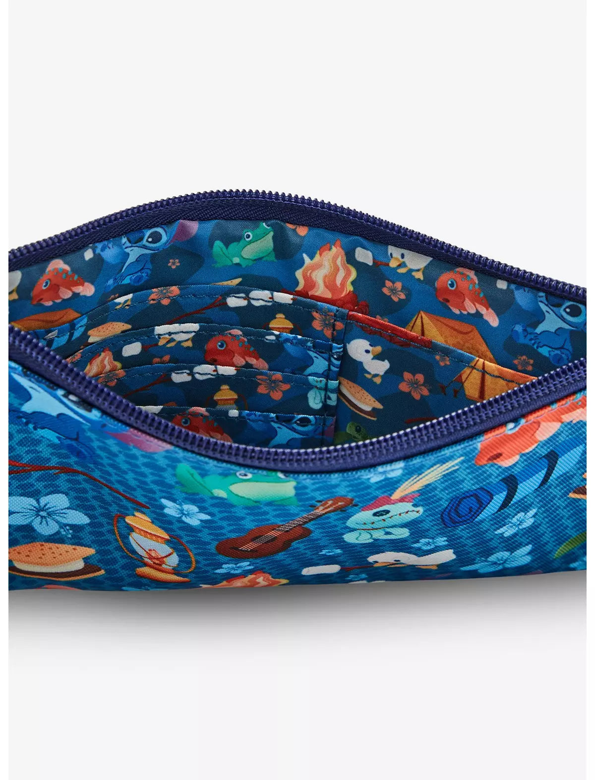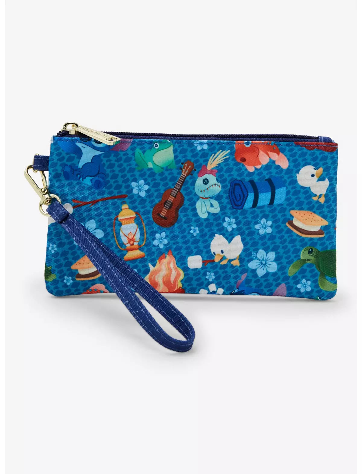 ¡Mantén tus elementos esenciales a mano en tu próxima aventura con esta pulsera inspirada en Lilo & Stitch! Con un estampado integral de Stitch, Scrump, animales y artículos para acampar, el interior de la bolsa incluye cuatro ranuras para tarjetas. Con una muñequera removible, este accesorio es perfecto para los fanáticos de la película de Disney.