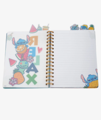 ¡Toma notas con la ayuda de Stitch! Este diario presenta frutas e hibiscos. Hay seis secciones con pestañas y páginas alineadas.