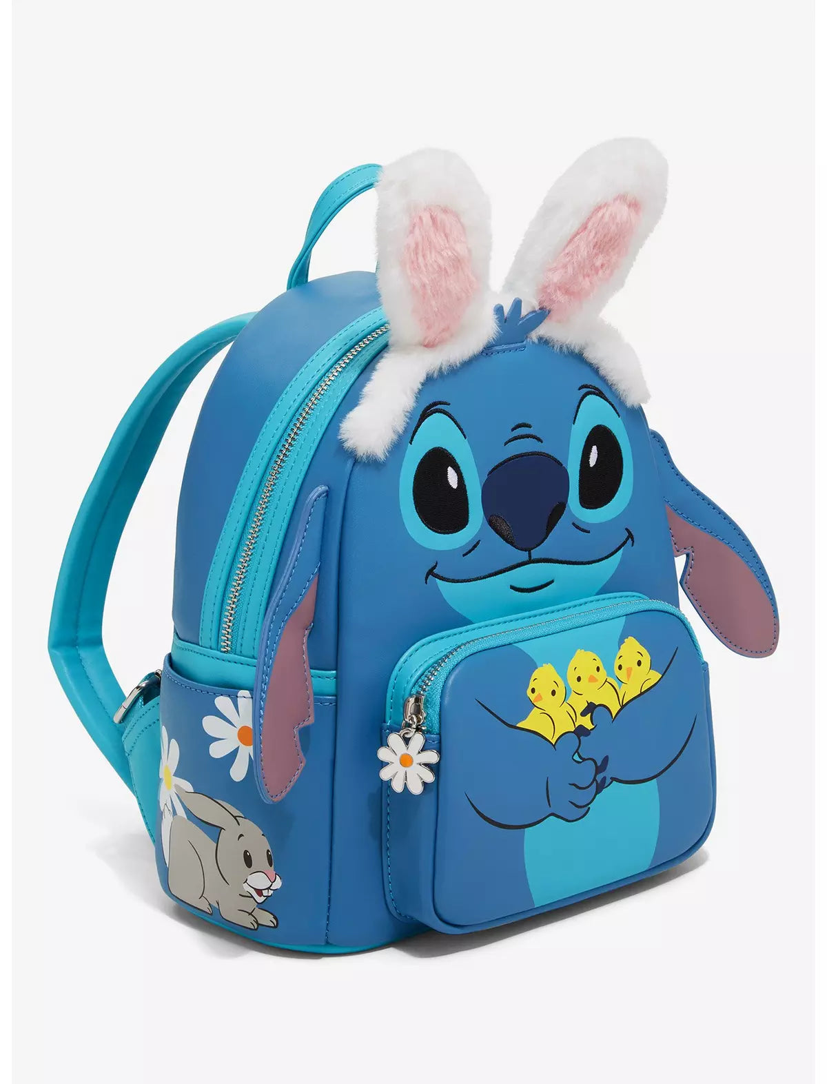 ¡Stitch le da un toque de estilo primaveral a tu look con esta mini mochila Loungefly! Inspirado en Lilo y Stitch, se ve al pequeño y adorable experimento abrazando a pollitos mientras luce una diadema con forma de oreja de conejo de piel sintética como diseño de esta mini mochila. También cuenta con un asa superior, correas ajustables para los hombros y un patrón de forro interior con puntadas de conejito.