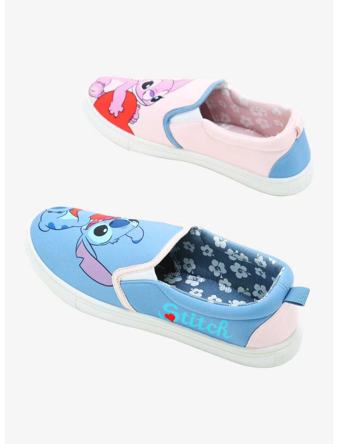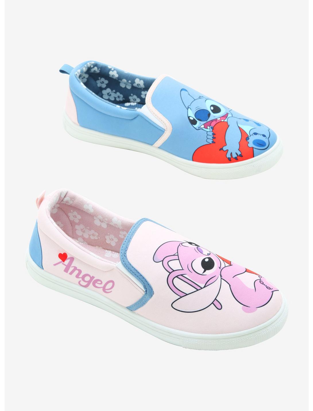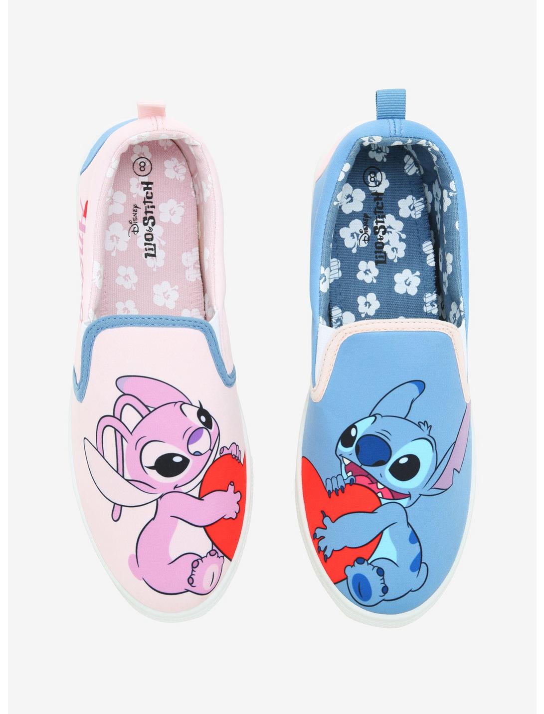 El amor puede ser una montaña rusa hawaiana, ¡pero vale la pena! Estas zapatillas sin cordones de Lilo & Stitch presentan a tu pareja alienígena favorita, Stitch y Angel, sosteniendo la mitad de un corazón. Hay un esquema de color rosa y azul que no coincide con "Stitch" y "Angel" resaltados en los costados con un corazón.