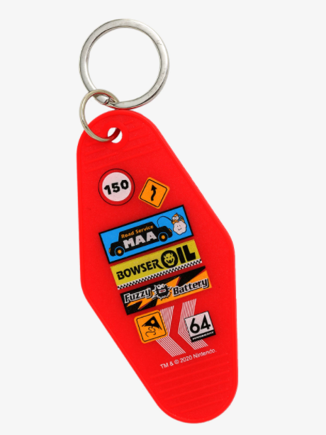 ¡Tus llaves de kart pueden usar un llavero divertido! Del juego de Nintendo Mario Kart, presenta un diseño a cuadros de "Mario Kart 8" en un lado e íconos como "Bowser Oil" y "Fuzzy Battery" en el otro.