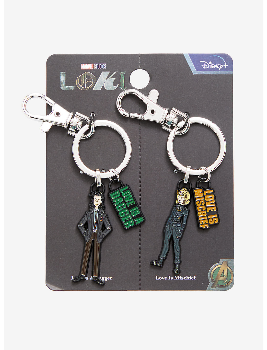 ¡Lleva tus variantes traviesas favoritas a tu bolso o llavero con este juego de llaveros de Marvel! Inspirado en el exitoso programa Loki, este conjunto de 2 piezas presenta diseños estilizados de Sylvie y Loki con amuletos de letras "Love is mischief" y "Love is a dagger" a juego. También cuenta con cierre de mosquetón en la parte superior.