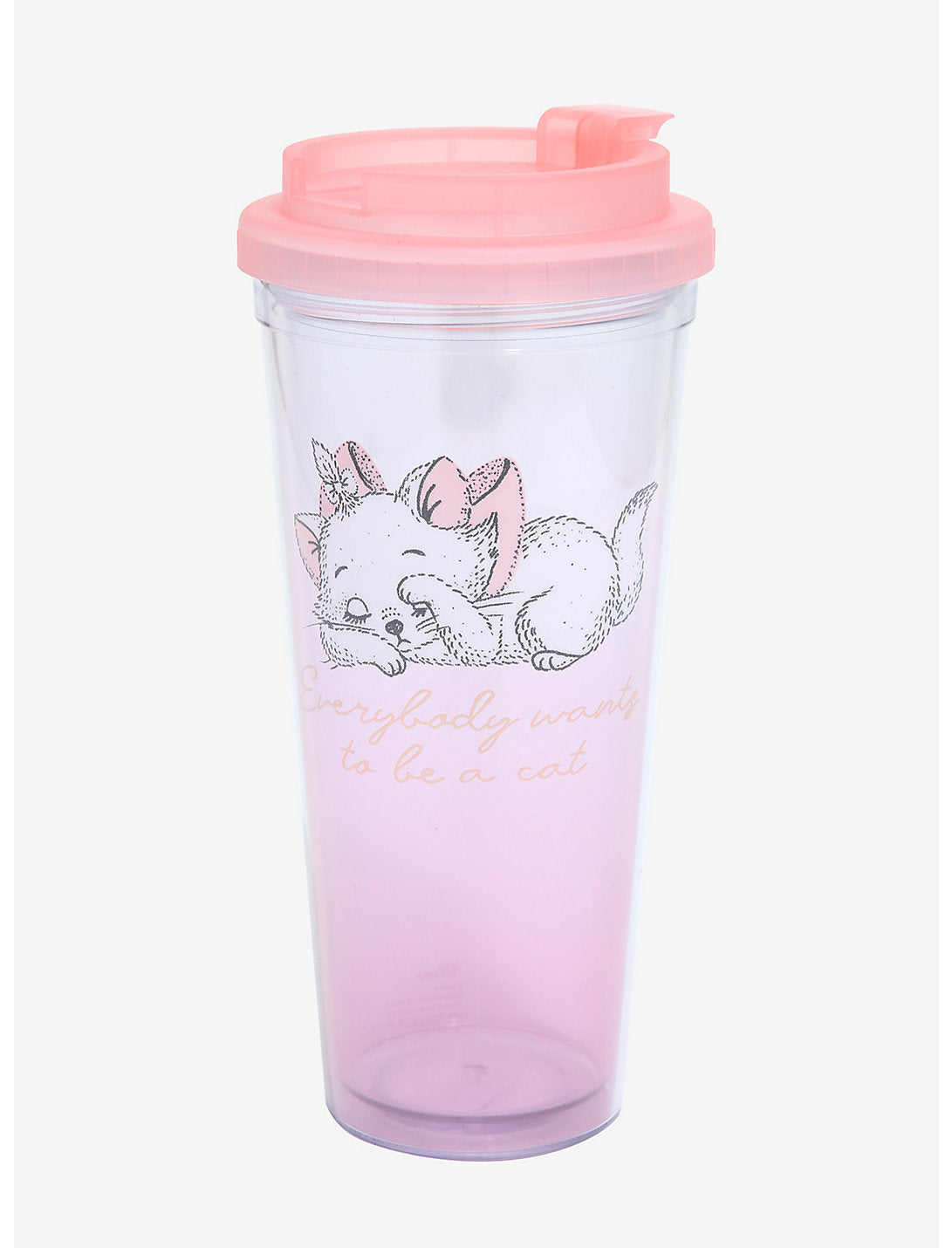 ¡Lleva contigo tus bebidas al estilo de los Aristogatos! Con un adorable gráfico de Marie durmiendo encima de las letras "Todos quieren ser un gato" inspiradas en la canción Alley Cats del clásico de Disney, esta confiable taza de viaje también viene con una tapa abatible.