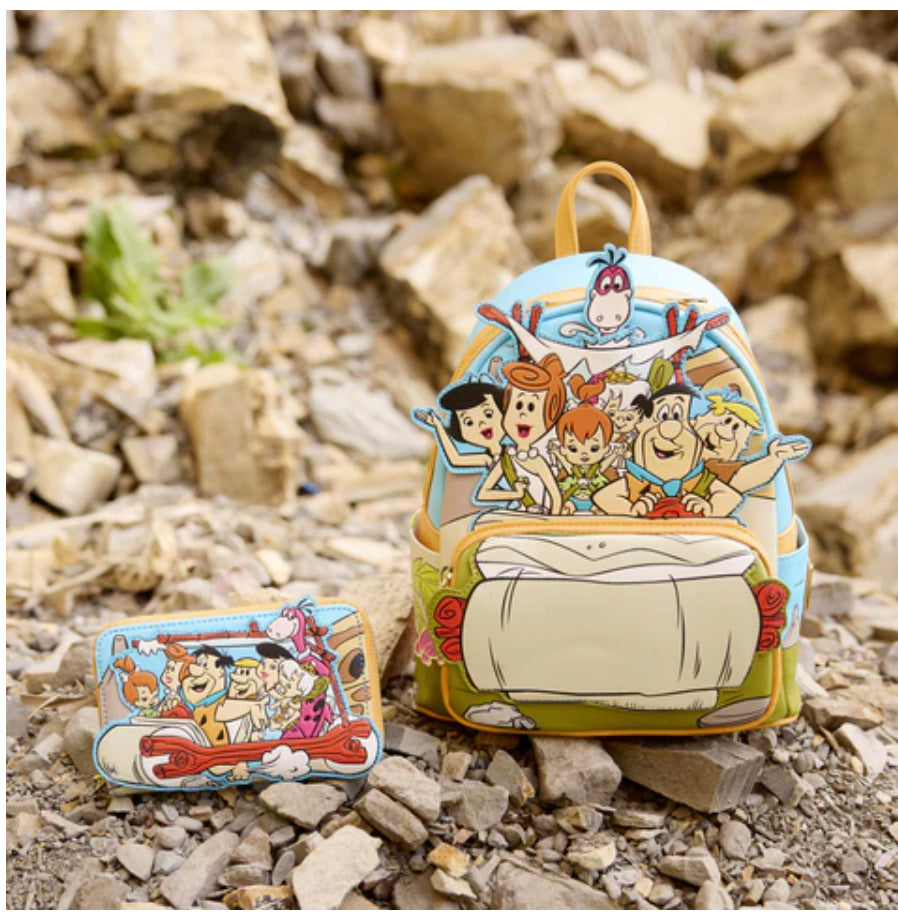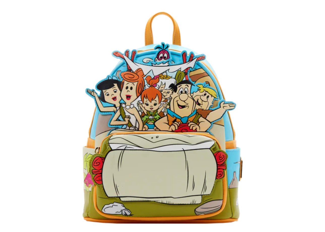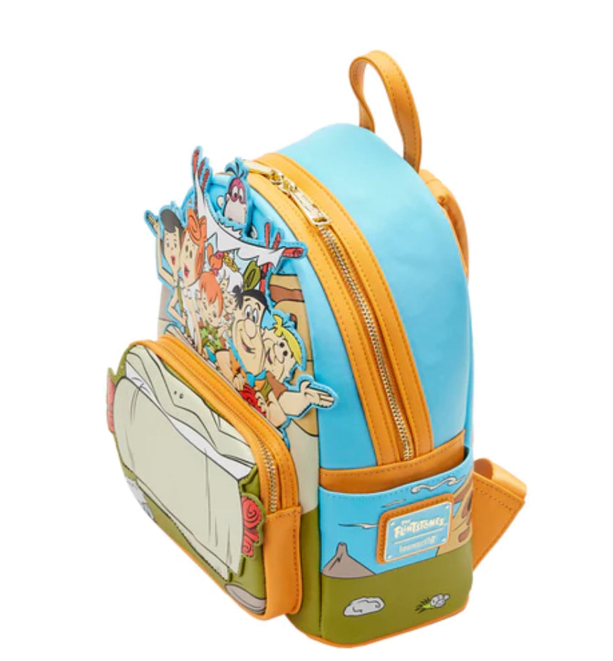 ¡Esta familia moderna de la edad de piedra está adquiriendo un nuevo aspecto! La mini mochila Loungefly Flintstones Flintmobile presenta a Fred y Wilma mientras dan un paseo prehistórico con sus amigos Barney y Betty. A medida que su automóvil avanza en el bolsillo delantero con cremallera de la bolsa, Pebbles y Bamm-Bamm los acompañan en el asiento trasero. Dino se mueve hacia arriba y hacia abajo para salir del techo del automóvil y hace una aparición repetida como un amuleto de cremallera esmaltado.