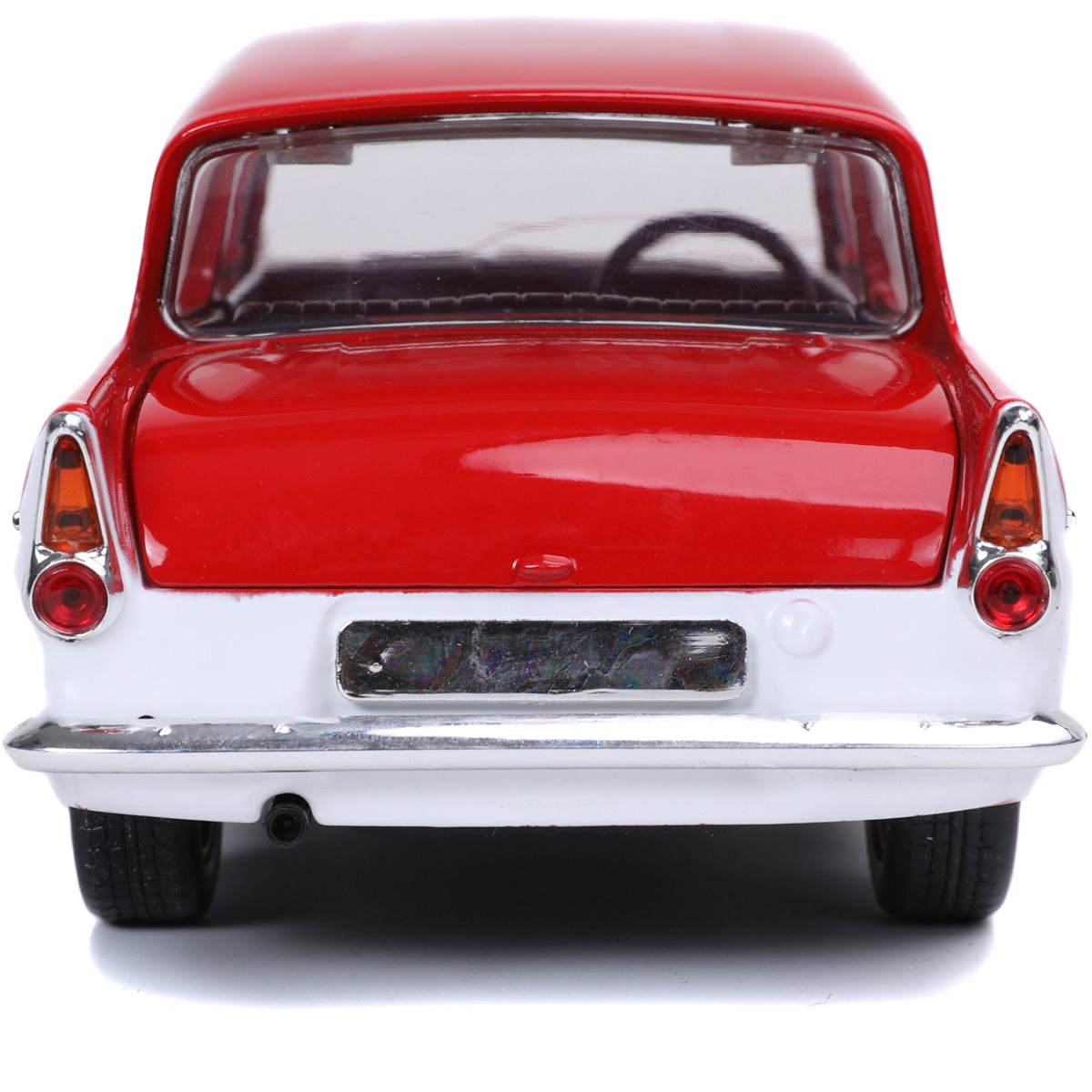 También se incluye una minifigura de metal fundido a presión Lucky. El vehículo y la figura vienen empaquetados en una caja de exhibición de ventana. El Ford Anglia de 1959 cuenta con puertas, capó y baúl que se abren, junto con un interior detallado.