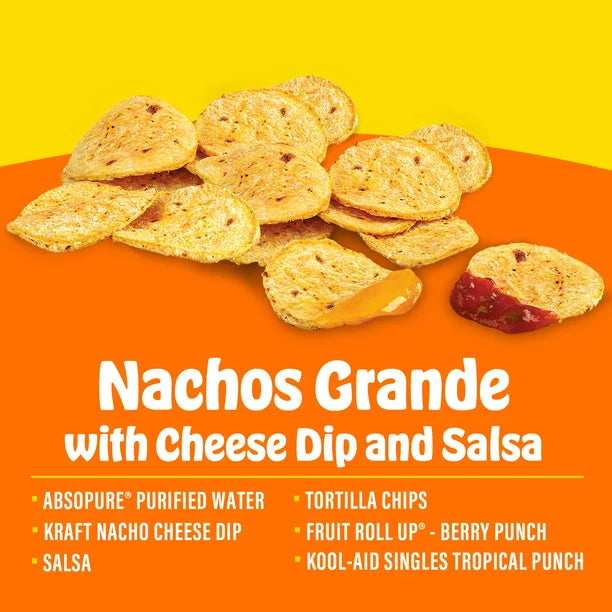 Lunchables Uploaded Nachos Grande with Cheese Dip and Salsa Meal Kit with Tortilla Chips, Fruit Roll-Ups Sour Berry Punch, Agua Absopure y Kool-Aid Tropical Punch, Caja de 13.92 oz