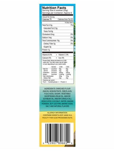 Harina enriquecida (niacina, mononitrato, riboflavina, ácido fólico), azúcar, manteca vegetal (aceite de palma y/o aceite de soja y/o aceite de canola), coco desecado, agua, levadura en polvo, lecitina de soja, bicarbonato de sodio, sal, y Sabores Naturales