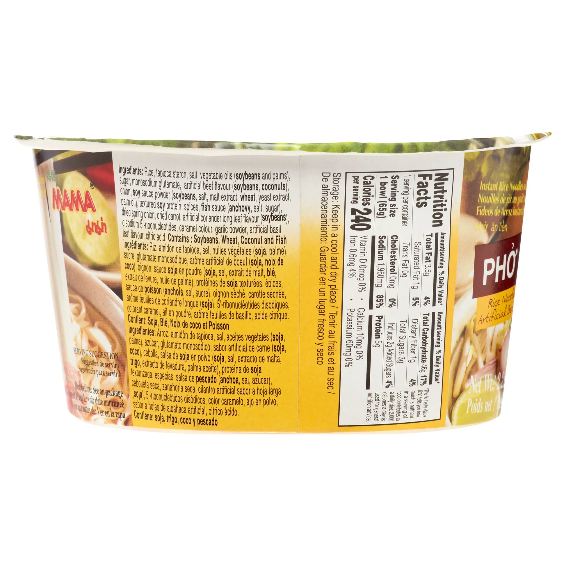Fideos de arroz Mama Pho Bo con sabor a carne artificial, 2.29 oz es un pho de estilo vietnamita que es una comida rápida y fácil de disfrutar. El caldo auténtico, mezclado con un toque de albahaca y lima, crea una sopa aromática y sabrosa que calentará el cuerpo. El perfil de sabor único será una sorpresa para aquellos que no están familiarizados con este plato, pero será bienvenido. La forma simple de linguini y la mezcla sabrosa que no contiene conservantes darán como resultado un plato de fideos delicioso para disfrutar. Abra parcialmente la tapa, agregue el condimento, vierta agua hirviendo hasta la línea de llenado, cubra la tapa y cocine en el microondas durante 4 minutos.