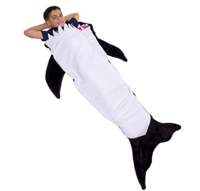 - Detalles de tiburón ferozes: ojos feroces, dientes afilados, y la aleta de tiburón clásica ayudan a que este saco de dormir sea el más aterrador. Una vez totalmente escondido dentro de la manta, el tiburón parece que está devorando a cualquier persona dentro.