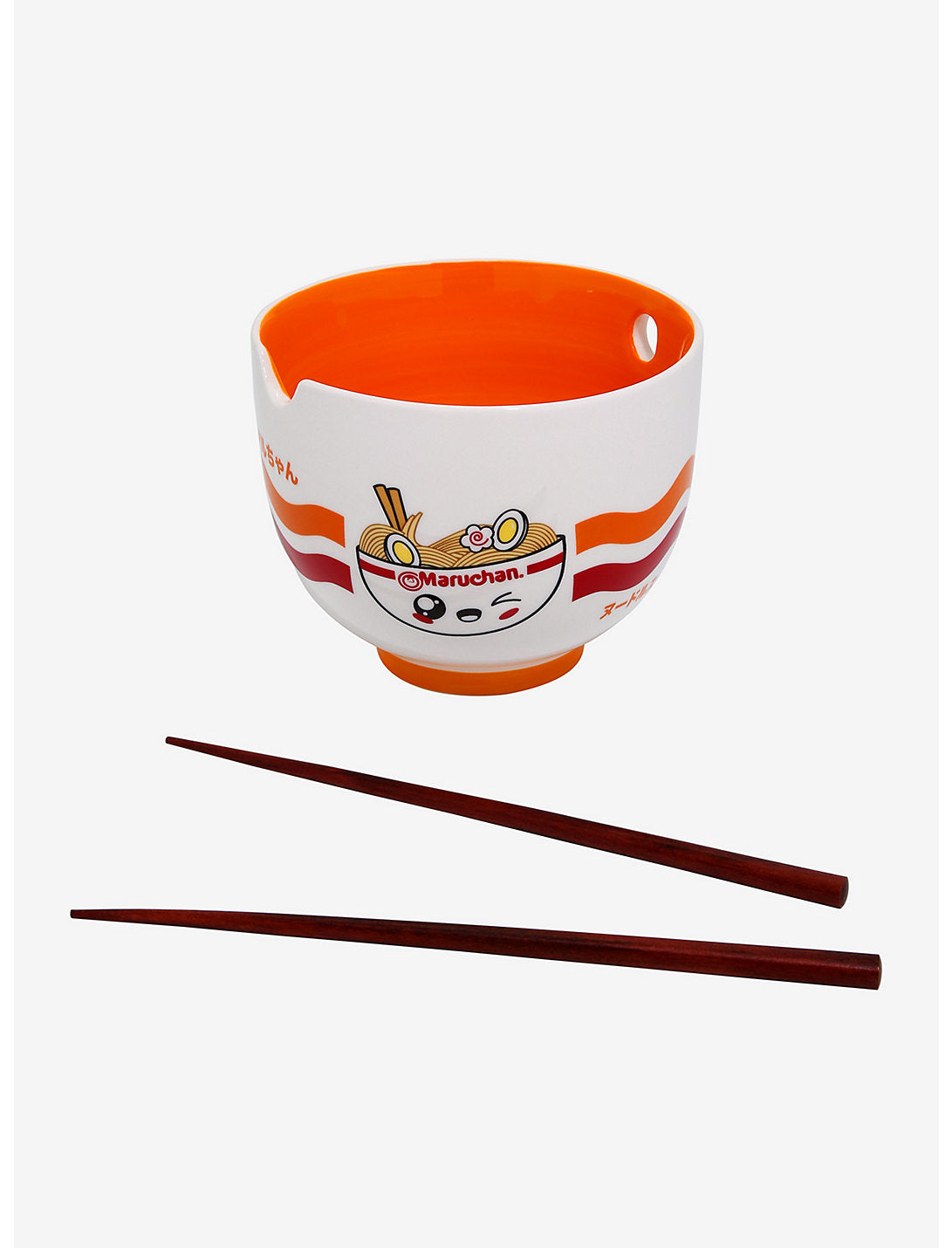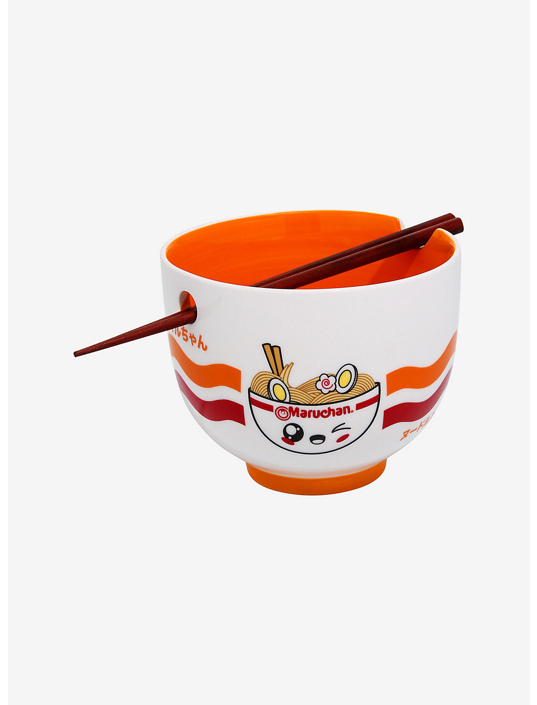 ¿Listo para el tazón de ramen más lindo y delicioso? Coge este cuenco con un diseño de logotipo chibi Maruchan con un par de palillos de madera.