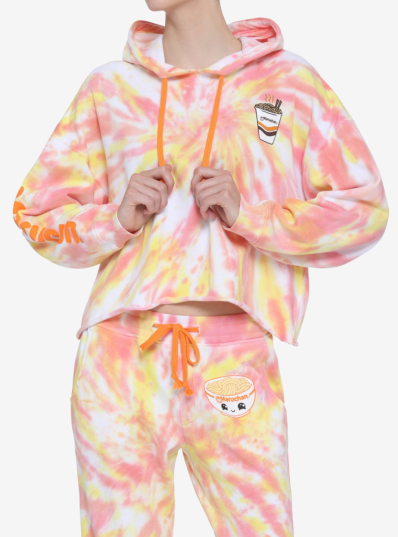 Esta sudadera con capucha de color naranja y amarillo está impresa con una taza del delicioso ramen en el lado izquierdo del pecho y el logotipo de Maruchan en la manga derecha.