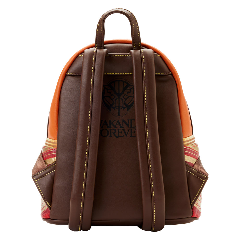 La mini mochila Loungefly Black Panther Okoye Cosplay está hecha de cuero vegano (poliuretano). La bolsa tiene correas ajustables para los hombros y herrajes metálicos resistentes. Las características adicionales incluyen apliques, grabados, relieves, costuras superiores y detalles impresos. Tome nota del forro interior a juego.