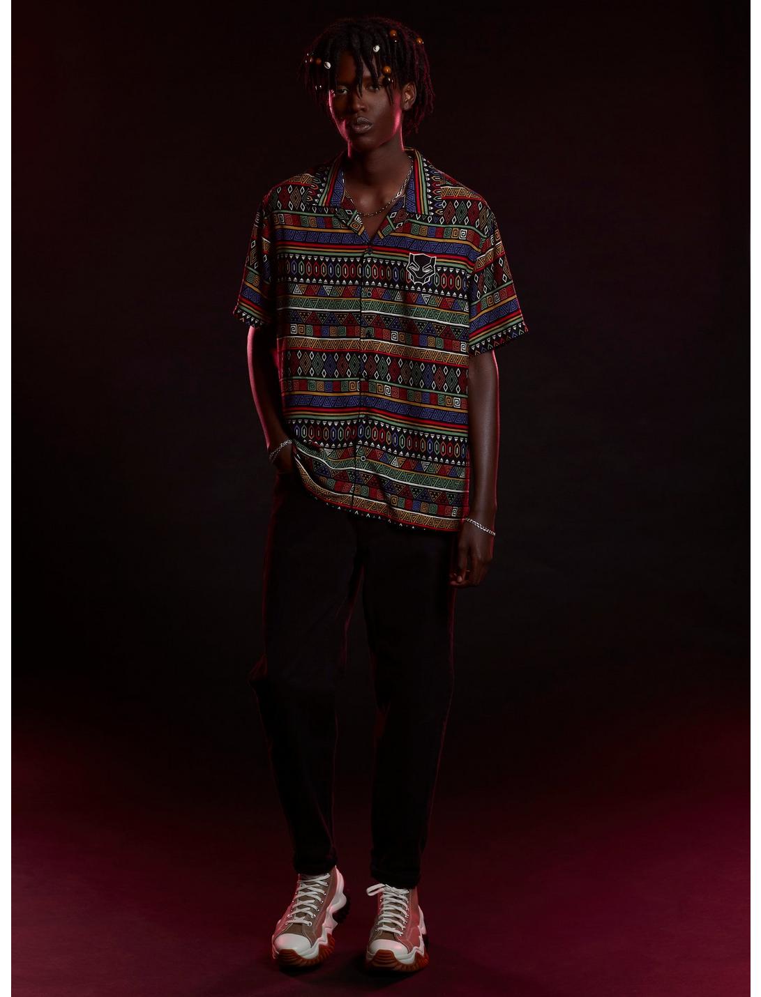 Muéstrales quiénes somos. ¡Regresa a Wakanda con la camisa tejida más genial! Luce este top justo a tiempo para Black Panther: Wakanda Forever. Presenta patrones geométricos coloridos en todas partes y la máscara de Black Panther bordada en el pecho.