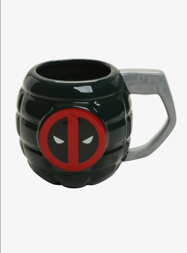 ¡Comience su día con una explosión! Esta taza de cerámica de Deadpool de Marvel presenta un diseño esculpido de granada de mano con el Merc con el logotipo de la máscara de la firma de una boca en los laterales.