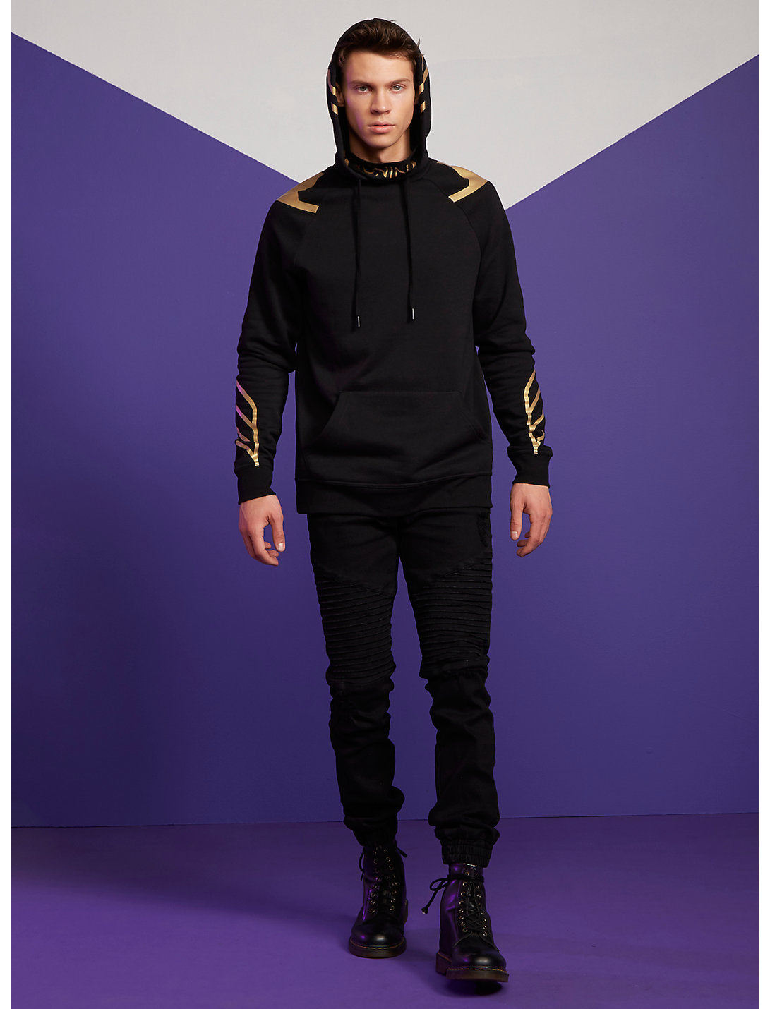 Adopta la apariencia de Ronin con esta sudadera con capucha negra de Marvel's Hawkeye con un diseño de lámina dorada en los hombros, las mangas y la capucha con una máscara que dice "Ronin".