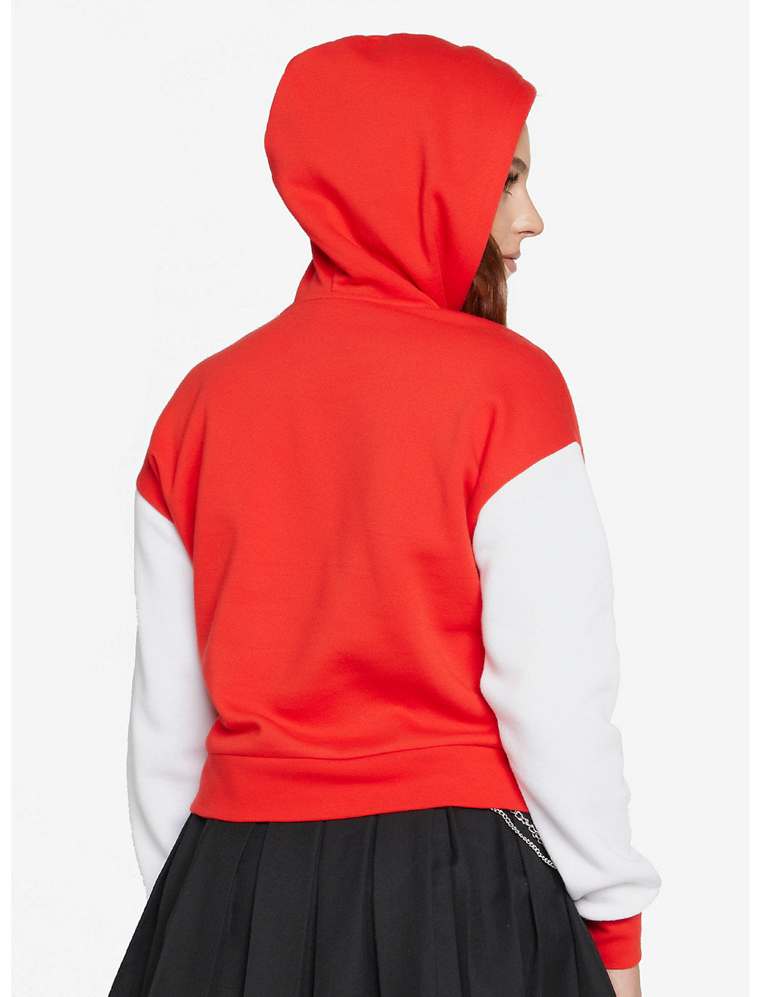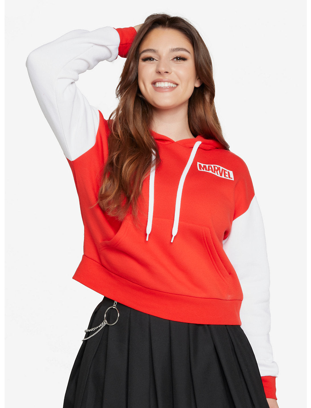 Siéntete maravillosamente acogedor con esta sudadera con capucha en bloques de color rojo y blanco con el logo de Marvel en el lado izquierdo del pecho.