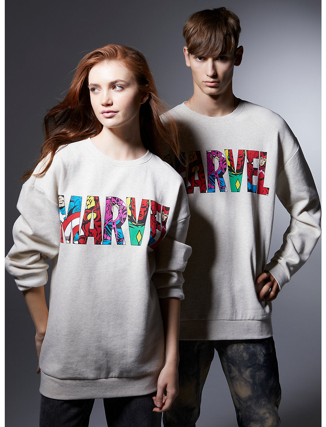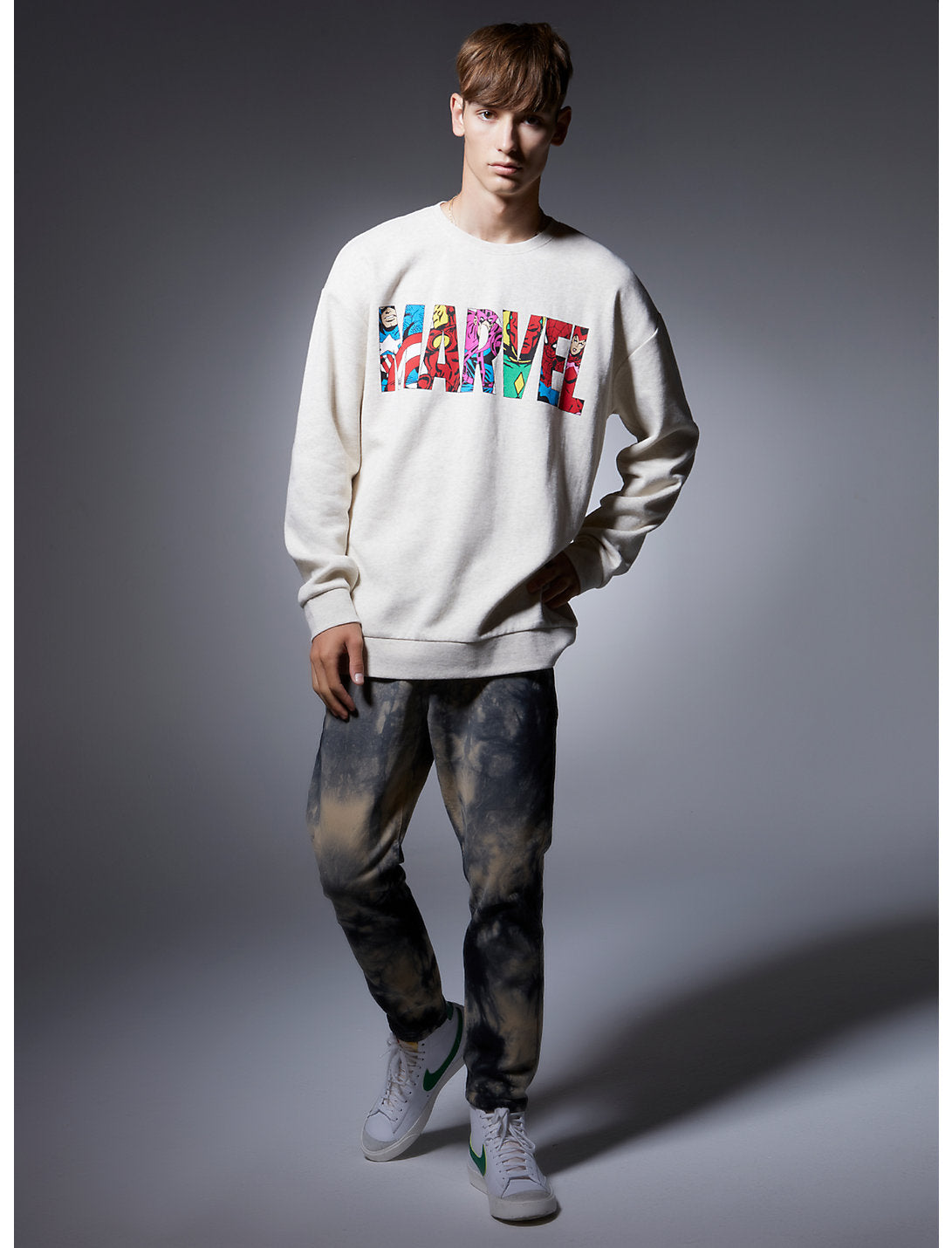 El poder del Universo Marvel está contigo cuando te pones este suéter de cuello redondo con un logotipo antiguo inspirado en un cómic en el pecho. Vision, Capitán América, Iron Man y más prestan su poder a este cuello redondo gris.