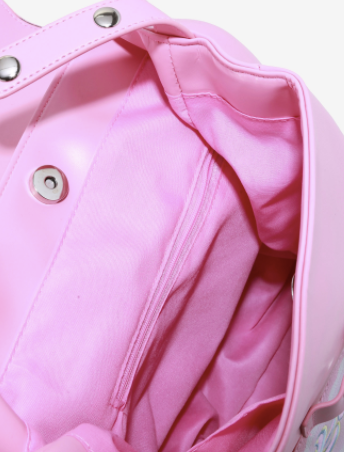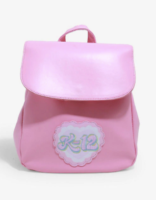 ¡Es hora de ir a clase! Esta mochila con solapa rosa de Melanie Martinez presenta un parche K-12 bordado en la parte delantera. El interior tiene un bolsillo con cremallera y dos bolsillos abiertos. Tirantes ajustables y cierre magnético con botón a presión.