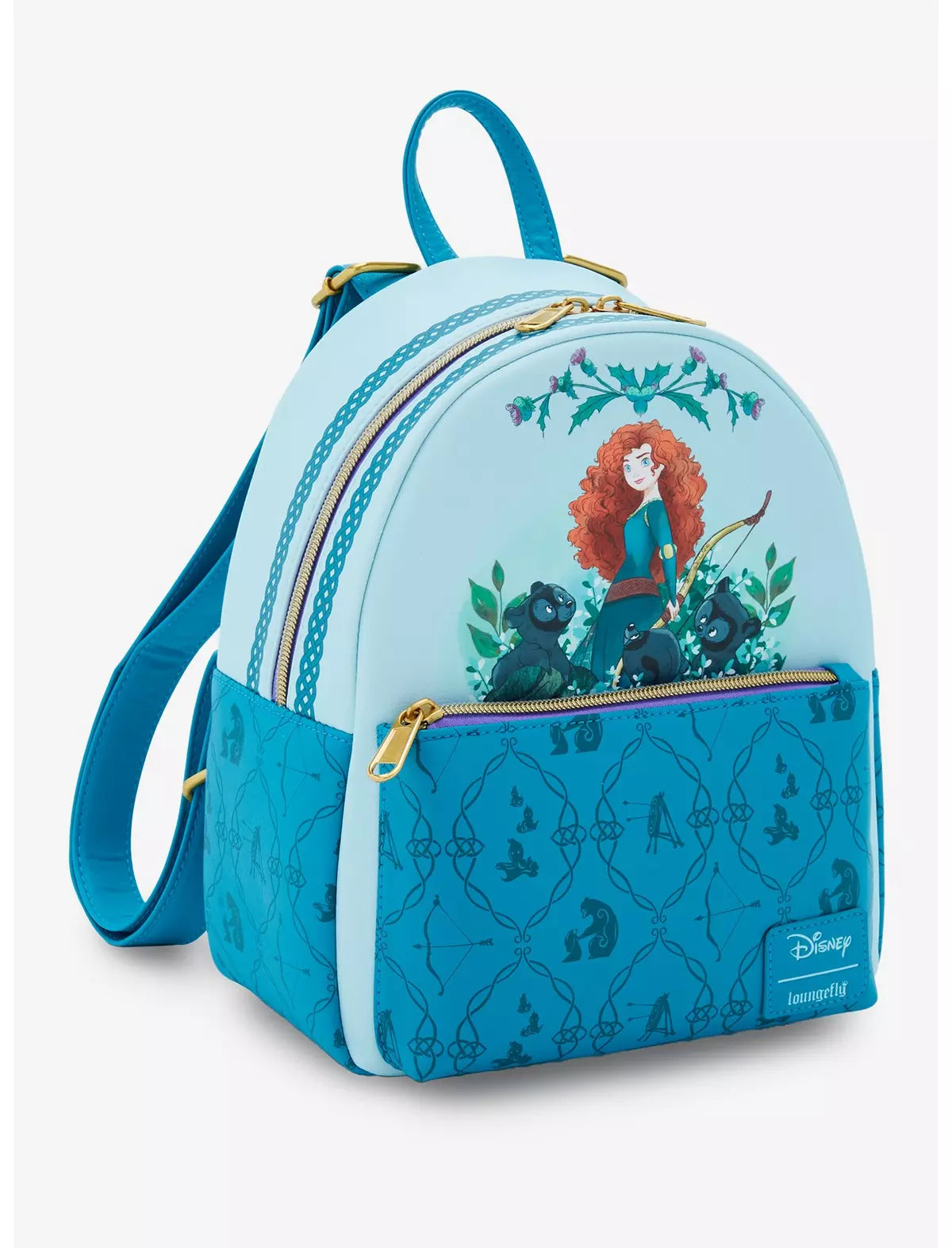 ¡Cambia tu destino con esta mini mochila Brave! Con Mérida al frente y al centro con su confiable lazo y sus traviesos hermanos osos. Otros íconos de la película están impresos en el bolsillo frontal con cremallera. Viene con correas ajustables y un bolsillo interior.
