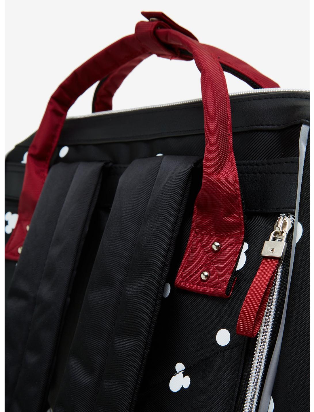 ¡Equípate a la moda de Disney con esta mochila de Mickey Mouse! Con un estampado integral de siluetas de Mickey y lunares, el frente de este bolso incluye un aplique de Mickey Mouse asomándose por encima del bolsillo delantero. Con bolsillos laterales, tirador de cremallera con guante de goma y asas superiores, este bolso es perfecto para viajes a los parques de Disney y más allá.