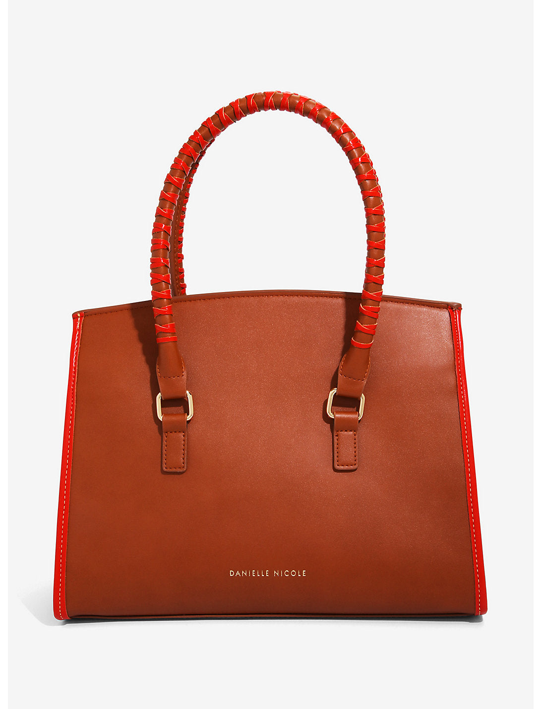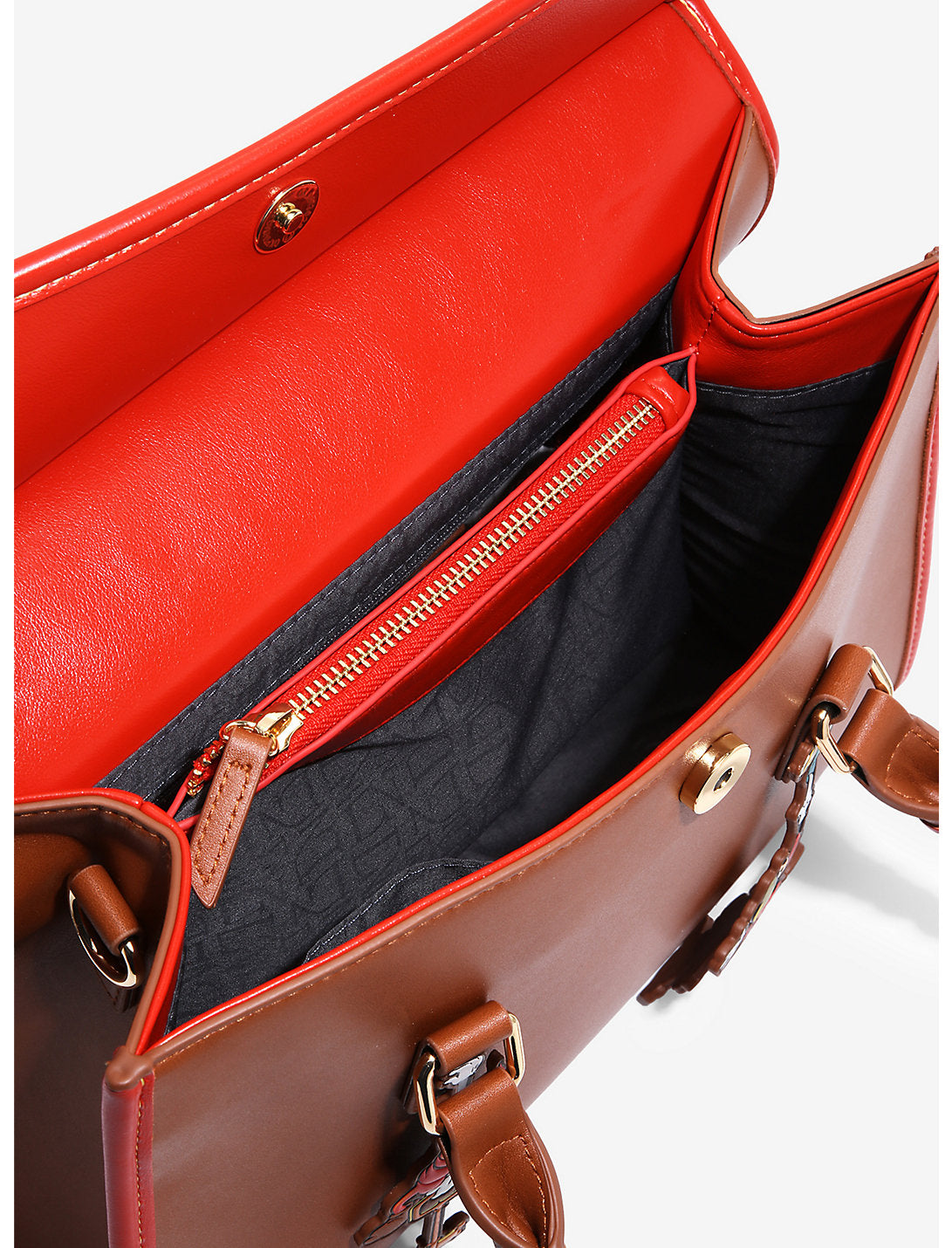 Fun y Fancy Free de Walt Disney pueden haberse lanzado hace más de 70 años, ¡pero su magia sigue viva hoy en el último bolso! Mickey Mouse, Pato Donald y Goofy cuelgan de las correas de este bolso de piel sintética marrón, inspirados en sus aventuras en la interpretación de Disney de "Jack and the Beanstalk". Las características adicionales incluyen un diseño de cordón rojo en contraste en los bordes y asas, cierre de botón magnético, herrajes en tono dorado, un forro interior con estampado del logotipo de Danielle Nicole clásico, bolsillos interiores con cremallera y caída, y una correa cruzada ajustable y extraíble.