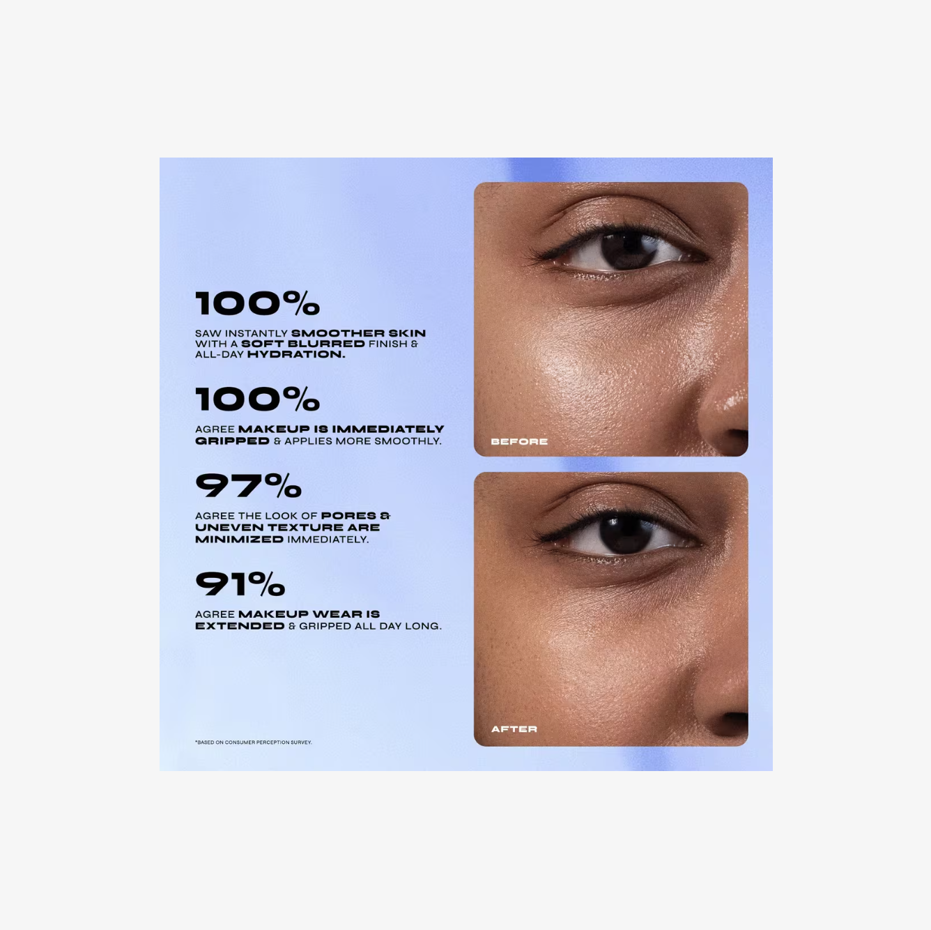 100% coincidieron en que la piel se sentía más suave al instante, con un acabado difuminado e hidratada todo el día*