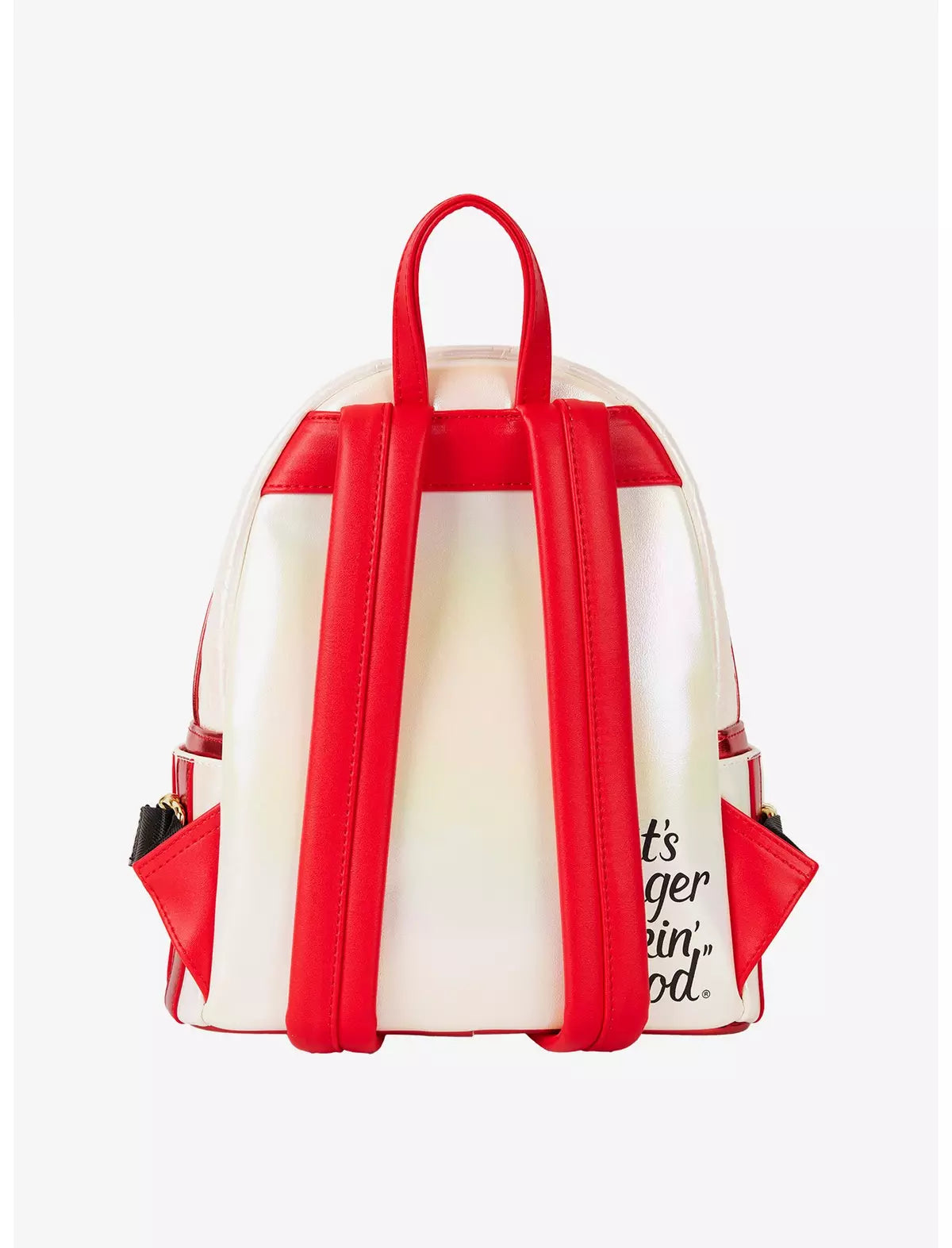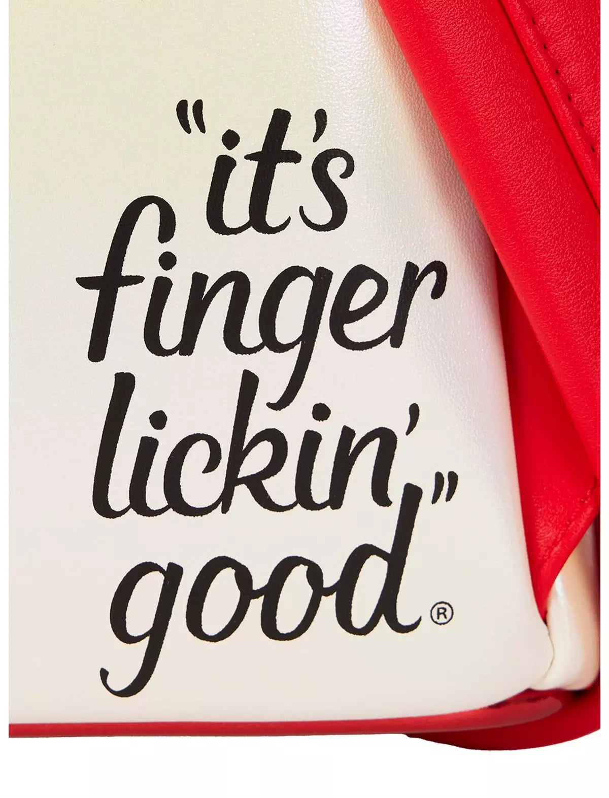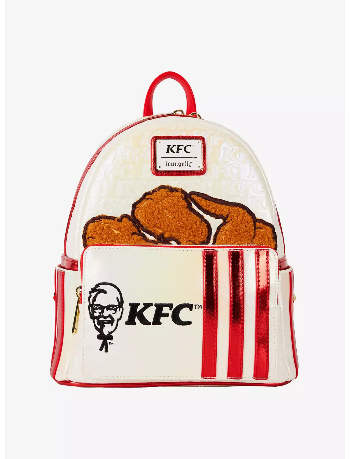 ¡Dale un toque de estilo a tu picnic con esta minimochila de KFC! Con un diseño bordado del Coronel Sanders y el logo en el bolsillo delantero, el cuerpo incluye apliques de sherpa de pollo frito y la palabra "KFC" en bajorrelieve. Con un brillo metálico y la inscripción "It's Finger Lickin' Good" en la parte trasera, esta mochila es perfecta para saciar tus antojos.