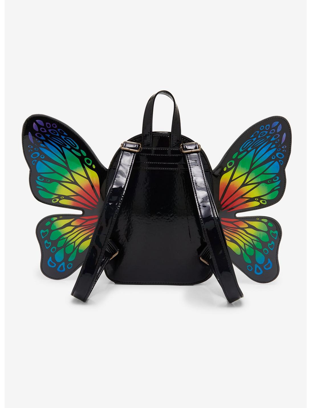 ¡Esta vibrante minimochila está lista para revolotear en tu colección de accesorios! Con un cuerpo de cuero sintético negro brillante con alas de mariposa arcoíris en los costados. Viene con bolsillo frontal con cremallera, bolsillos laterales y un bolsillo interior.