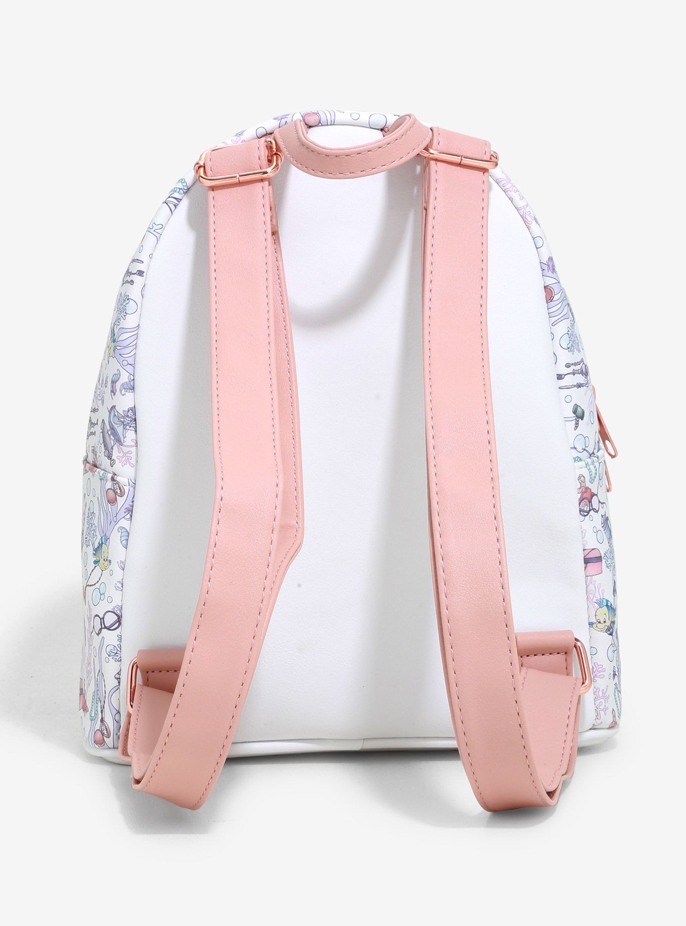 Esta mochila de The Little Mermaid presenta a Flounder, Sebastian y muchos de sus tesoros coleccionados. Tirantes ajustables, herrajes en tono oro rosa y amuleto de sirena Ariel en la cremallera del bolsillo delantero. Poliuretano de 8 "x 4" x 11 "