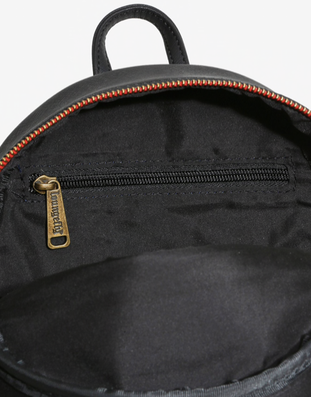 Mochila de piel sintética, junto con un bolsillo frontal con cremallera, dos bolsillos laterales y correas ajustables con estampado gráfico. También presenta detalles en contraste en naranja y rojo, cremalleras en tono bronce y un bolsillo interior con cremallera.