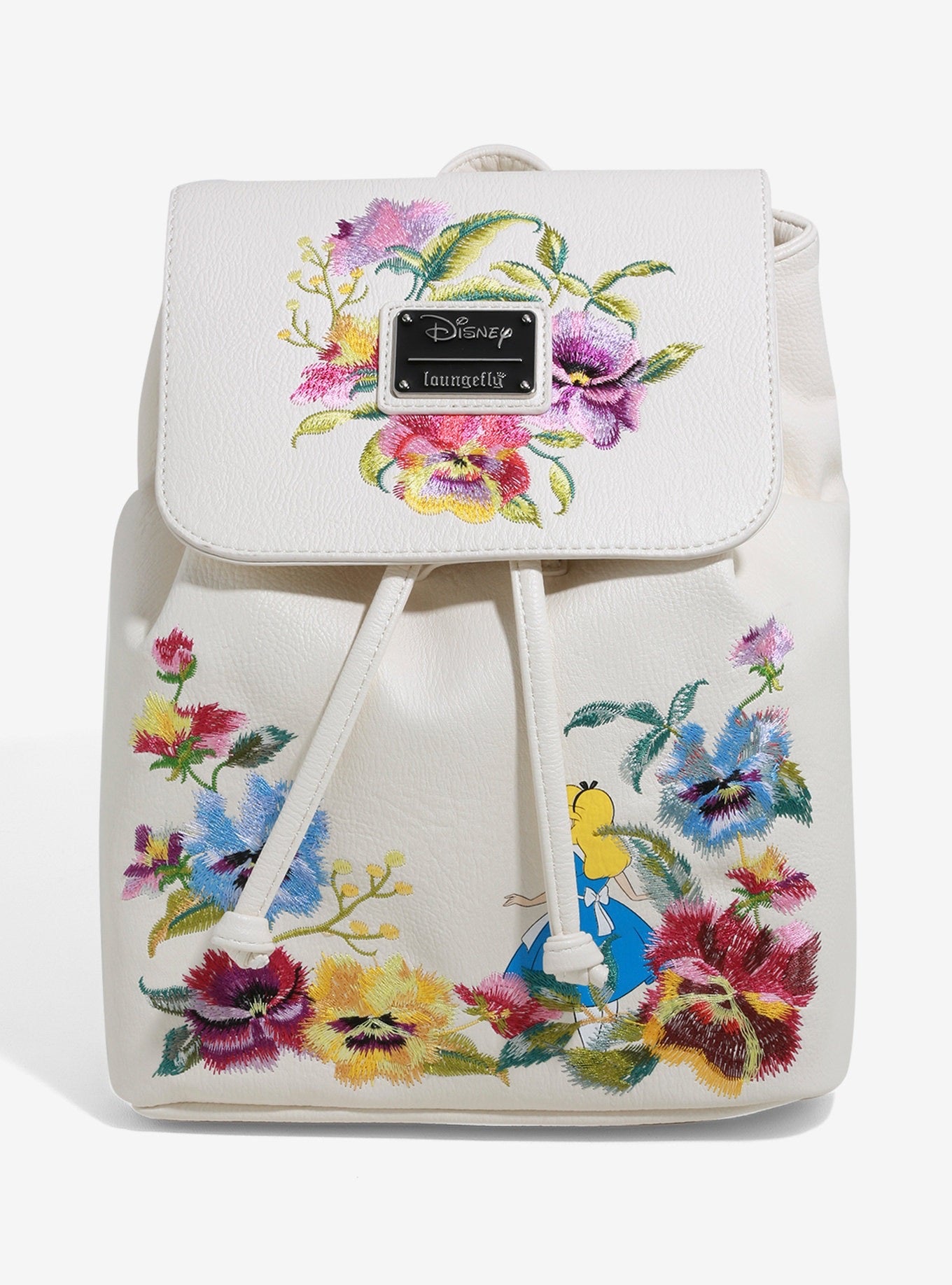 Cuenta con bordados en el exterior inspirados en las flores cantantes de Alicia en el país de las maravillas de Disney, un gráfico impreso de Alicia, una abertura de cubo con cordón cubierta por una solapa de botón magnético, una insignia de la marca, forro interior periwinkle con un patrón de Alice, caída interior y bolsillos con cremallera y correas ajustables.