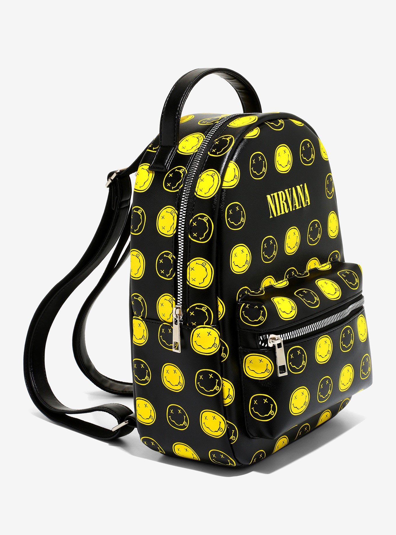 Lleva tus cosas mejor de lo que podrías en una caja con forma de corazón. Esta mini mochila de Nirvana cuenta con un estampado completo en negro y amarillo de su icónico logo de sonrisa. Correas ajustables, bolsillo frontal con cremallera y bolsillo interior abatible. 9 "x 4" x 12 " Poliuretano Importado