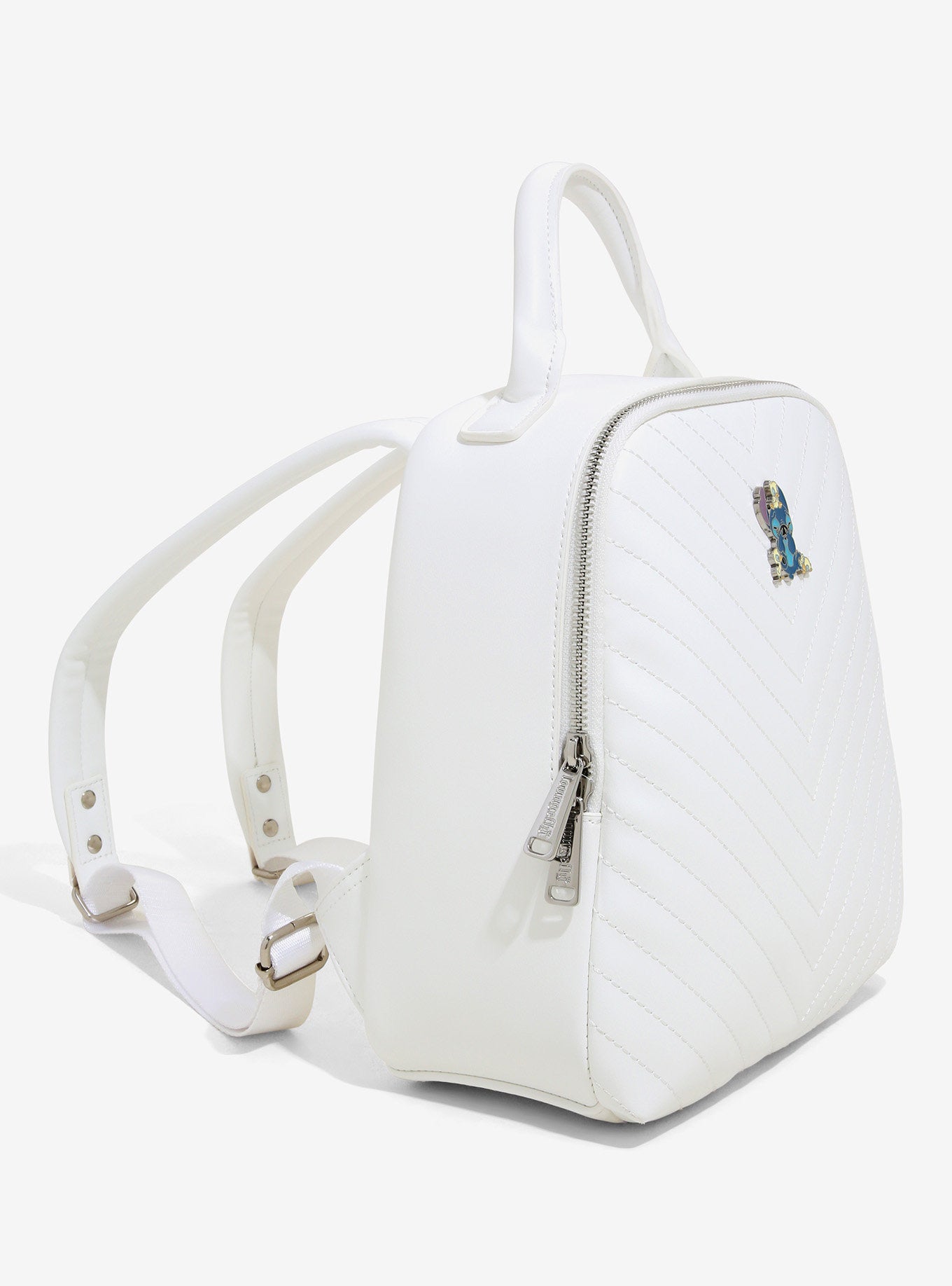 - Esta mini mochila presenta un diseño simple pero elegante que Stitch probablemente haría un desastre si tuviera la oportunidad. ¡Menos mal que tiene a sus amigos patitos para distraerlo! Inspirado en Lilo & Stitch de Disney, este bolso tiene un diseño acolchado en blanco, complementado con herrajes en tonos plateados, y una adorable insignia esmaltada de Stitch con algunos patitos en la parte delantera. Las características adicionales incluyen correas de hombro ajustables, una placa de la marca esmaltada, un forro interior Stitch y un bolsillo interior con cremallera.