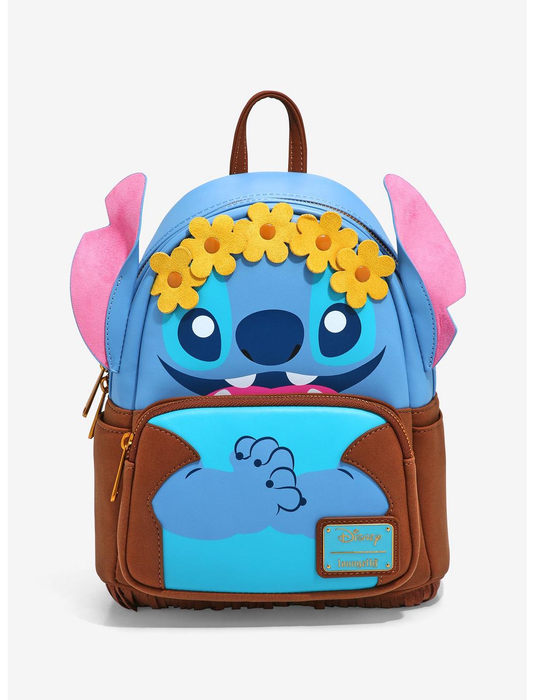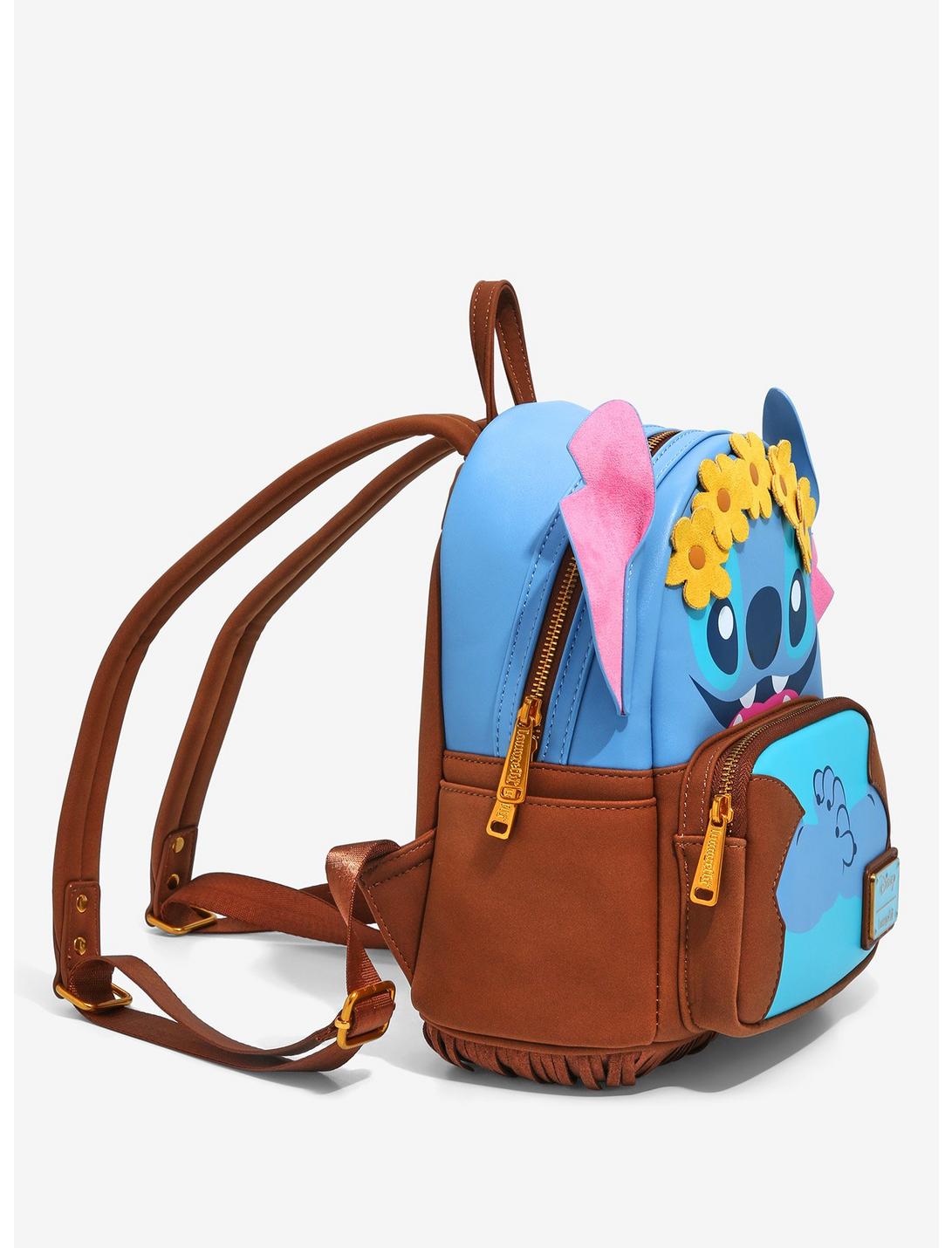 - ¡Stitch quiere traer un poco de paz y amor a todos tus viajes con esta minimochila de Disney de Loungefly! Vestido con su atuendo hippie, la corona de flores y la chaqueta con flecos del adorable experimento aparecen como detalles de apliques troquelados de este bolso, completando el look con orejas figurativas de Stitch en el lateral. Con una insignia esmaltada de la marca, herrajes en tono bronce y correas ajustables para los hombros, ¡esta minimochila seguramente le dará un toque tropical maravilloso a cualquier atuendo!