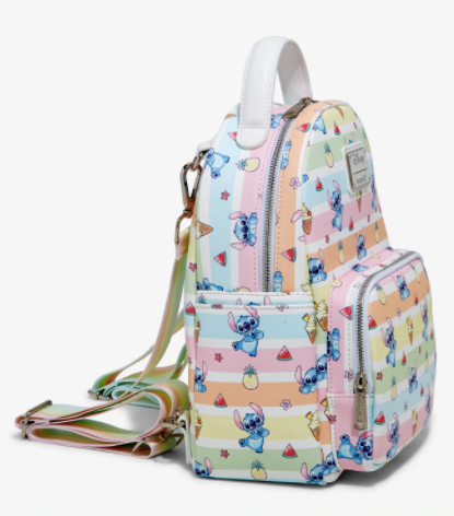 ¡Esta mochila no puede ser más dulce! El amado alienígena de Lilo & Stitch de Disney está impreso en todo el exterior junto con rodajas de sandía, piñas, conos Dole Whip, flores y rayas en colores pastel. Incluye compartimento principal, compartimento frontal con cremallera, dos bolsillos laterales, un bolsillo interior con cremallera, una placa de marca y correas de nylon ajustables y extraíbles que se pueden usar para convertirlo en un cuerpo cruzado.