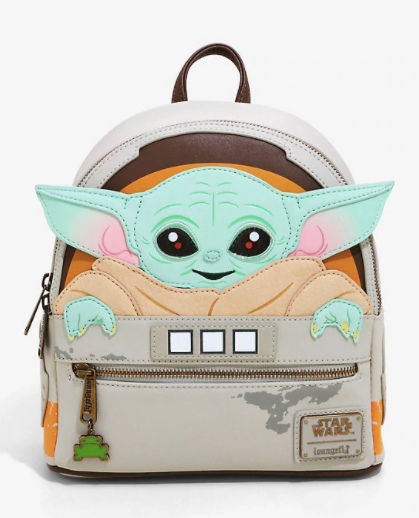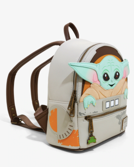 Con la forma del cochecito de The Child de The Mandalorian, esta mini mochila de piel sintética tiene un espacioso compartimento con cremallera, un bolsillo interior con cremallera y un bolsillo frontal con cremallera para guardar todos tus bocadillos. "Baby Yoda" puede acompañarte a todas partes, asomándose desde el cochecito con detalles troquelados, bordados y en relieve.