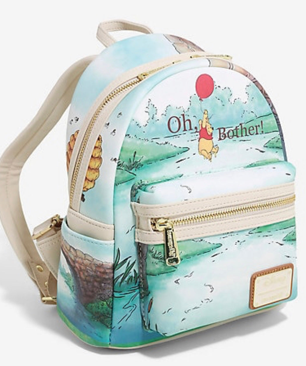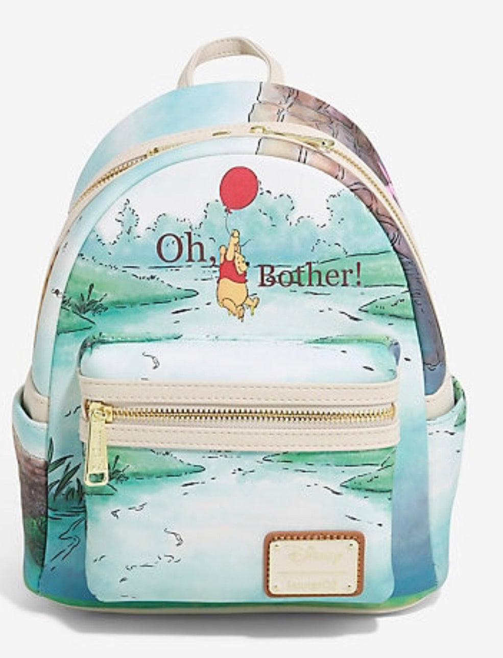 Presenta un gráfico de Pooh flotando sobre un río con un gran globo rojo, hardware dorado, una insignia de la marca de esmalte, bolsillo frontal con cremallera, compartimento principal con cremallera y bolsillos laterales.