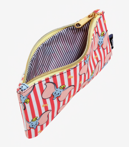 La escuela puede ser estresante. ¡Manten tus suministros organizados y en un solo lugar con la ayuda del elefante volador favorito de todos, Dumbo! Este estuche a rayas rojas y blancas presenta una impresión de Dumbo y maní y hardware dorado.