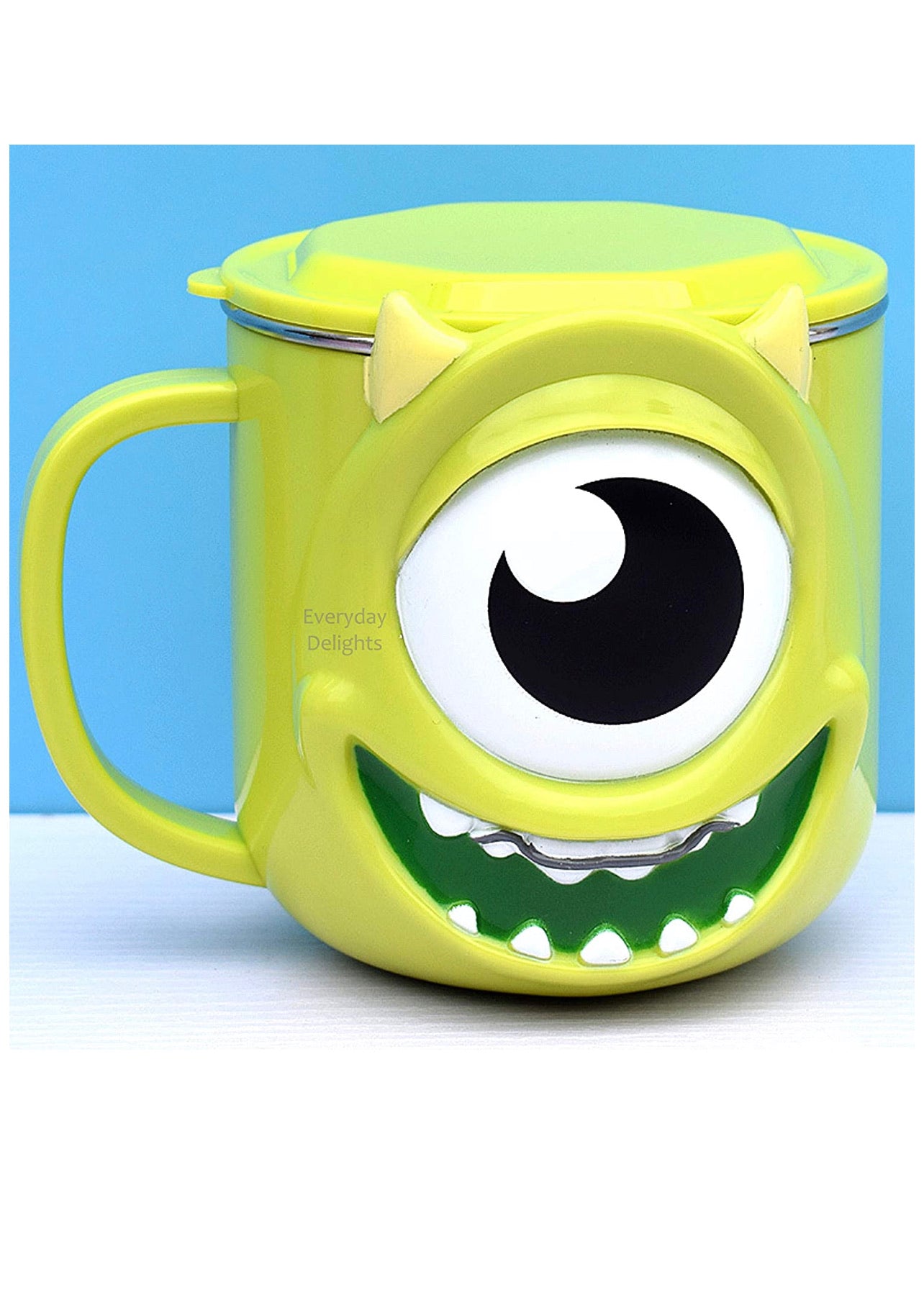 - Taza hecha de ABS con una bonita cara de carácter tridimensional, un recipiente de acero inoxidable y una tapa.