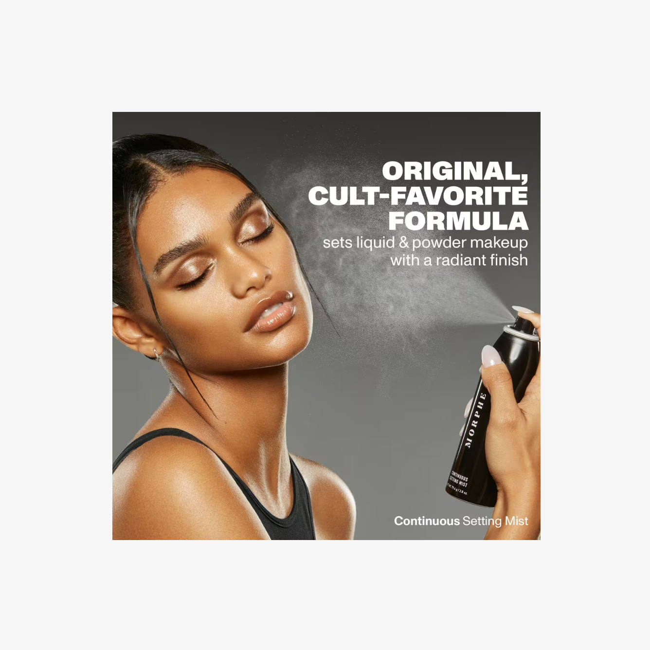 Morphe Continuous Setting Mist fija el maquillaje líquido y en polvo, mejorando su duración y apariencia durante todo el día. Su rociado continuo con tecnología de aire proporciona una aplicación uniforme, controlada y de acabado radiante natural.