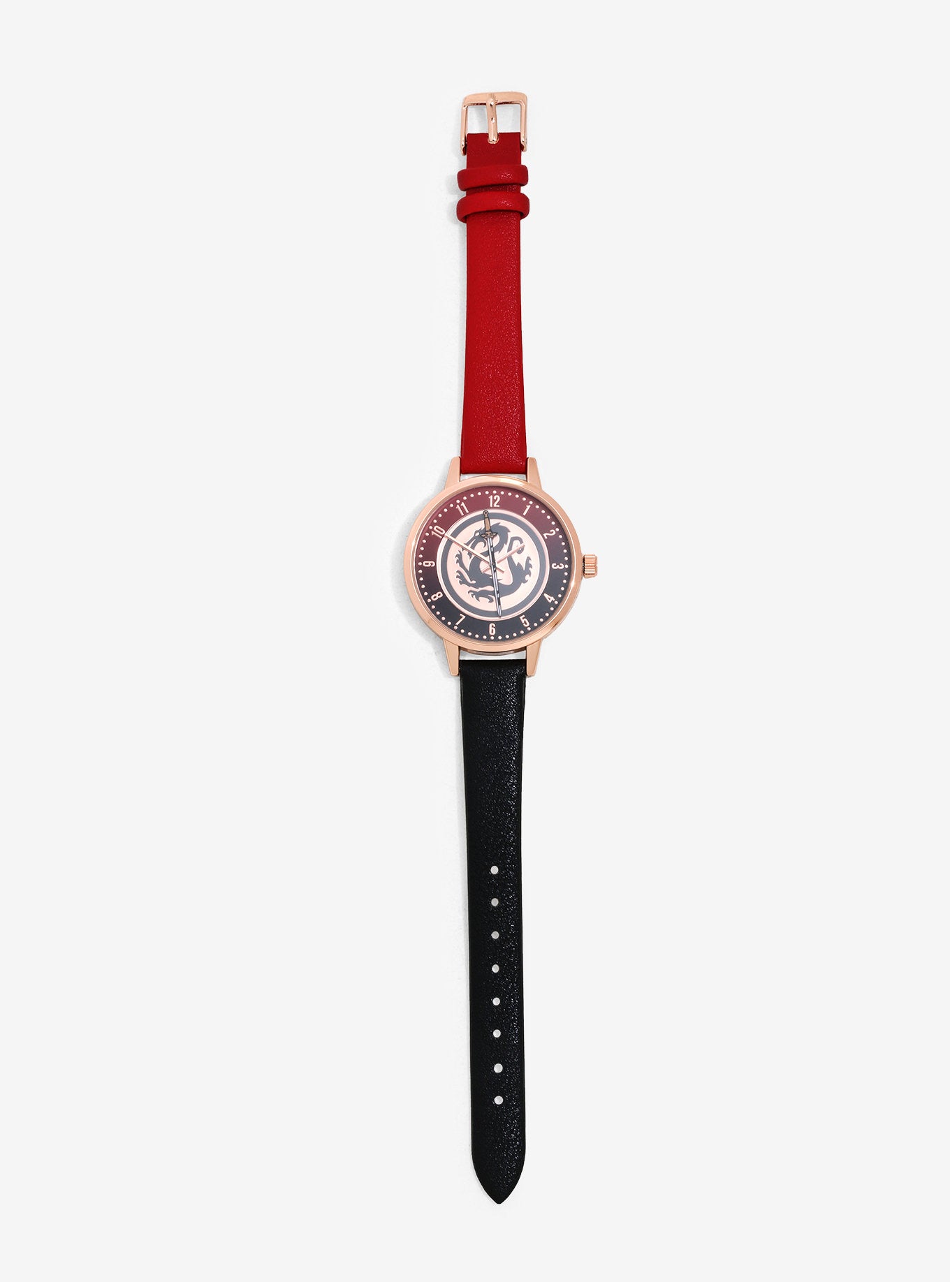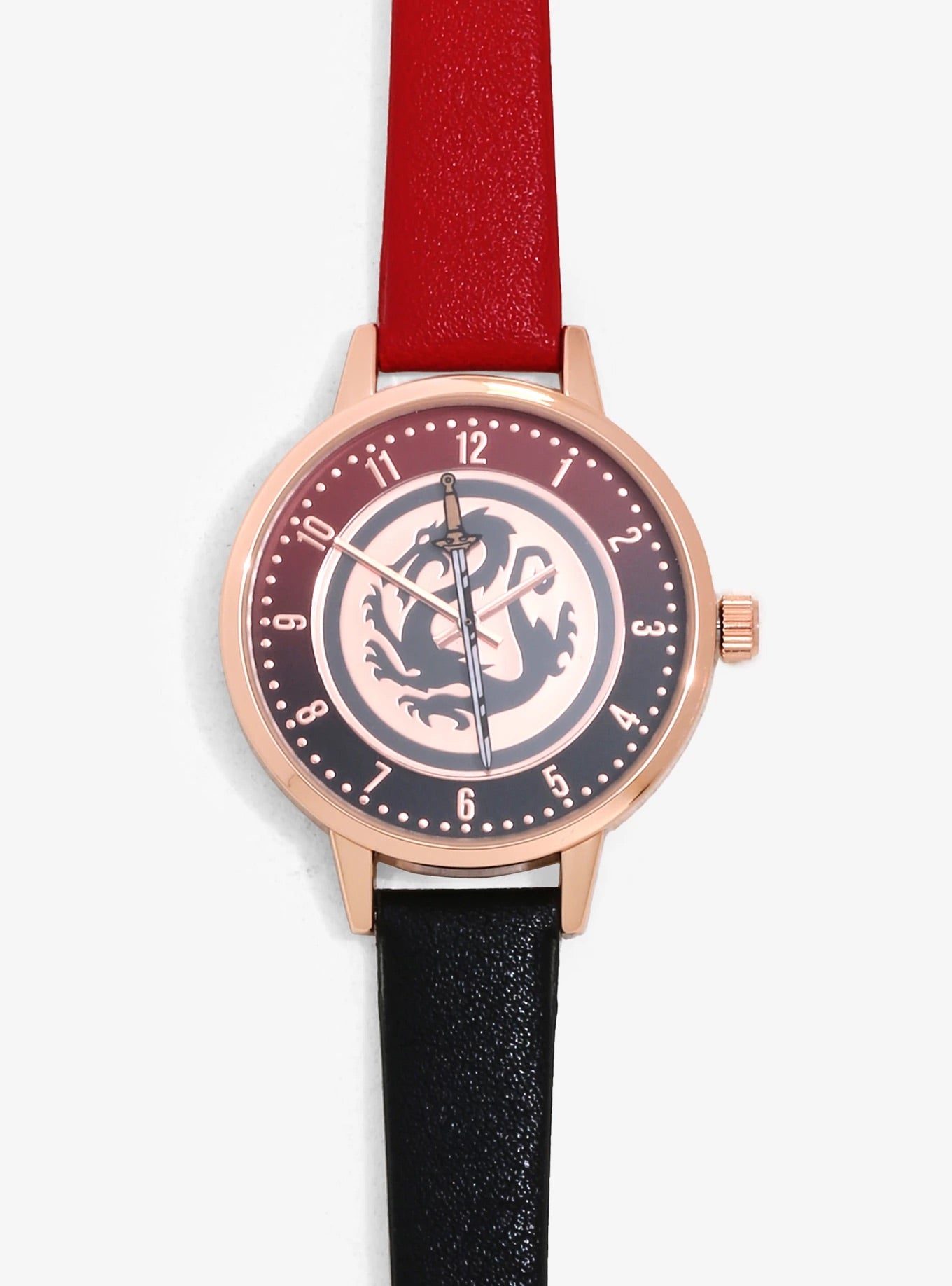 ¡Celebra los 20 años de tu princesa guerrera favorita, Mulan! Esta esfera de reloj analógico presenta un diseño ombre rojo y negro con un dragón y una espada como una de las manos. Una correa es roja y la otra negra.
